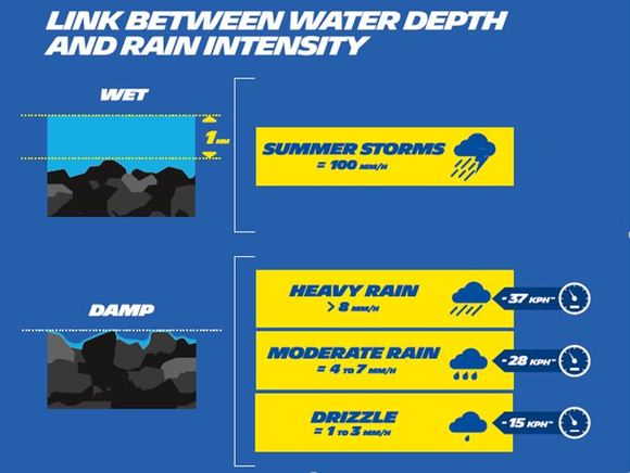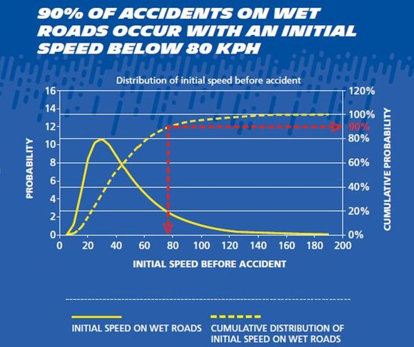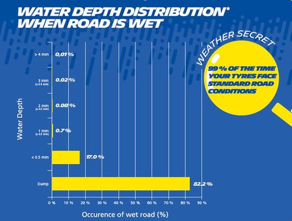 Může se zdát, že 1 milimetr vody na silnici není moc, ale… Například v Německu představuje 99 % jízdních podmínek suché silnice, vlhké silnice nebo mokré silnice s hloubkou vody menší než 1 mm.
