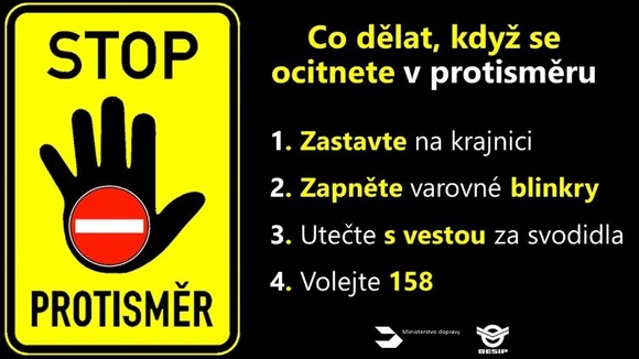 Ministerstvo dopravy vydalo povolení k umístění varovných dopravních značek STOP – PROTISMĚR. Tabule budou osazovány na nejrizikovější dálniční úseky. První informační značky STOP – PROTISMĚR se zítra objeví na prvních čtyřech vybraných rizikových lokalitách na dálnicích. Označení STOP – PROTISMĚR by mělo vést k omezení situací, kdy se dezorientovaný řidič dostane do protisměru v nájezdu na dálnici.