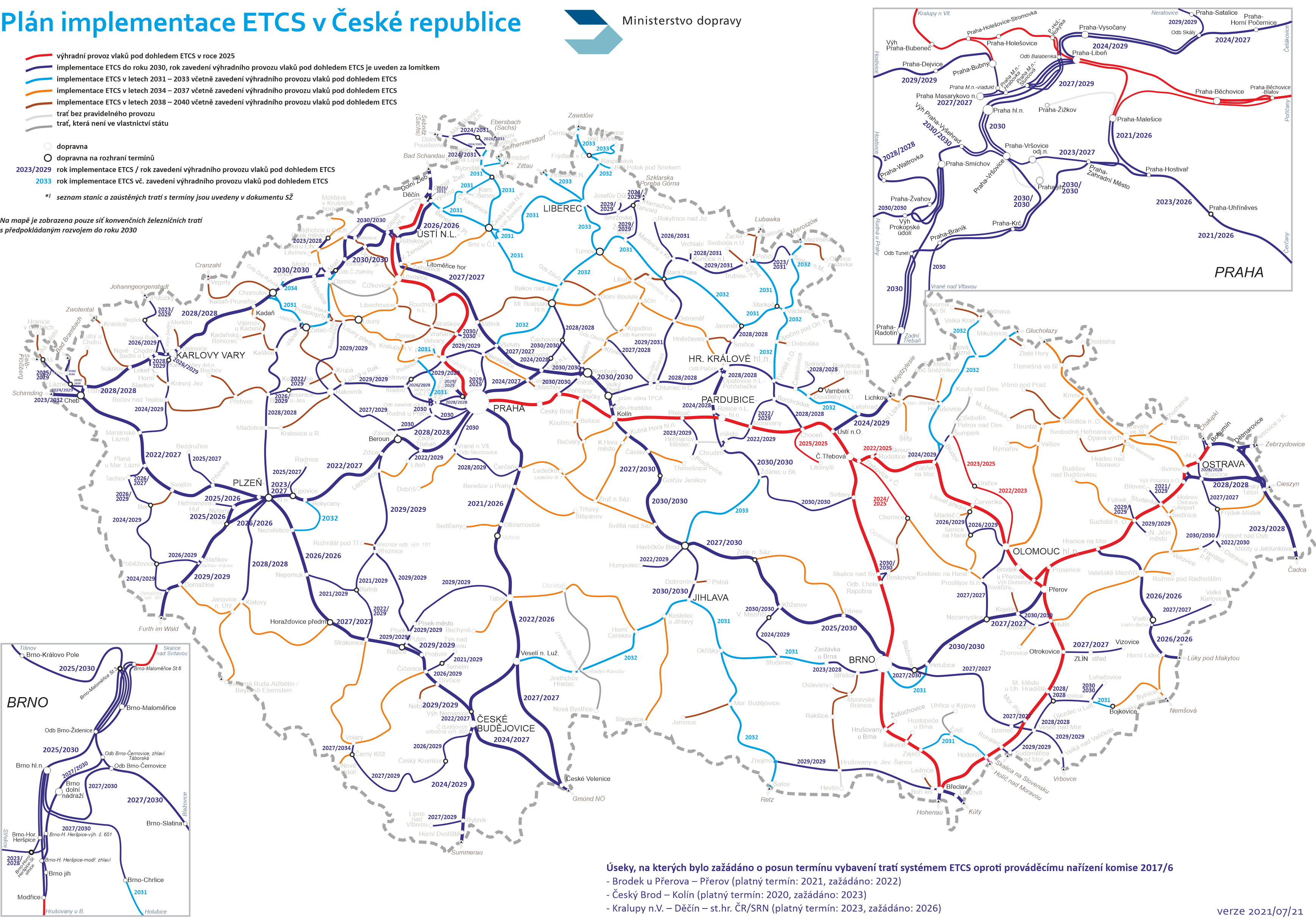 Součástí Plánu je mapa tratí (viz příloha) v ČR s uvedením termínů implementace ETCS a zavedení výhradního provozu vlaků pod dohledem tohoto systému.