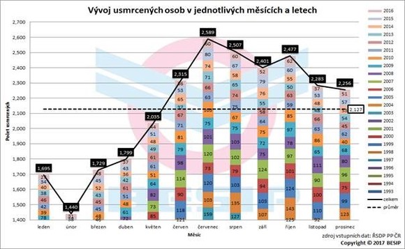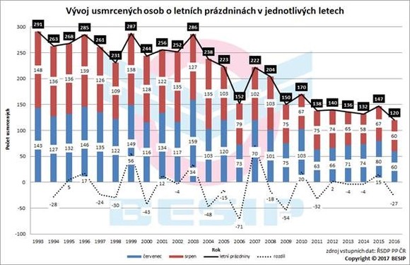 Zpravidla (1993 – 2016) nejvíce usmrcených osob připadá na červenec, v pořadí druhým měsícem je srpen. V loňském roce bylo o prázdninách usmrceno 120 osob, což je historické minimum. V meziročním srovnání zemřelo v důsledku nehody o 27 osob méně (-18 %). K rekordnímu (-71 osob) meziročnímu snížení došlo v roce 2006, kdy od 1. července nabyla účinnost novela zákona zavádějící bodové hodnocení řidičů.