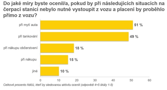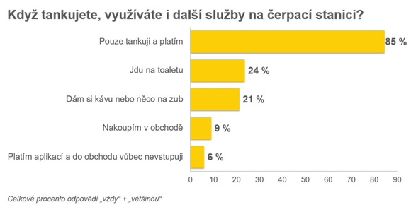 Mezi tři nejdůležitější faktory při výběru čerpací stanice dlouhodobě patří cena, lokalita a kvalita paliva. Stále více také čeští řidiči slyší na různé bonusy a věrnostní programy. Víc jak polovina dotázaných řidičů na čerpací stanici zastavuje pouze za účelem tankování, mobilní platba za palivo je tedy pro ně ideálním řešením. Oproti tomu 24 % řidičů si zároveň s tankováním odskočí na toaletu, 21 % si zase koupí kávu či něco dobrého na zub a skoro 10 % si pak stihne nakoupit v obchodě na stanici. Dle průzkumu ženy řidičky a muži řidiči si tyto doplňkové služby na čerpacích stanicích užívají nastejno.