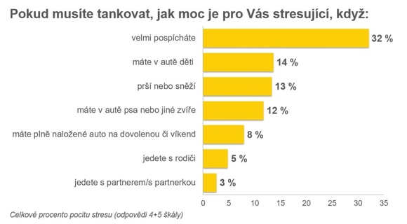 Společnost Shell Czech Republic a.s. dlouhodobě uzpůsobuje nabídku svých služeb aktuálním potřebám řidičů. Nedávno provedený průzkum mezi českými řidiči spojený se zvyklostmi při tankování ukázal, že pro třetinu řidičů je největším stresujícím faktorem spěch, a to především pro mladší generaci. 14 % řidičů pak nerado tankuje, pokud veze v autě děti. 58 % z nich obecně nerado nechává po natankování auto s dětmi bez dozoru.