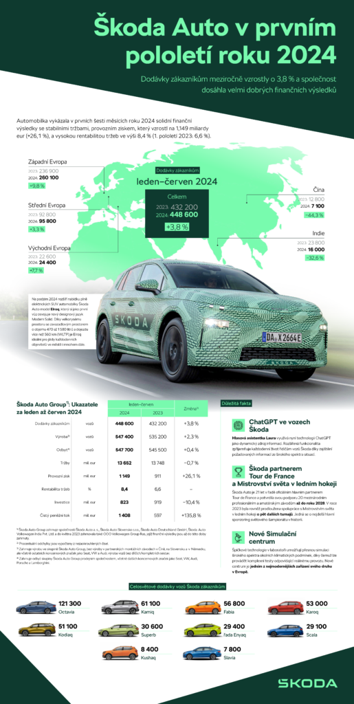 Škoda Auto prokázala v prvních šesti měsících roku 2024 značnou finanční sílu. Provozní zisk vzrostl na 1,149 miliardy eur (+26,1 %) a rentabilita tržeb dosáhla 8,4 % (před rokem: 6,6 %). Klíčem k tomuto úspěchu je nejrozsáhlejší produktová řada v historii značky nabízející to nejlepší z kategorie vozů se spalovacími motory i s elektrickým pohonem. Díky tomu meziročně vzrostly dodávky po celém světě o 3,8 % na 448 600 vozů.