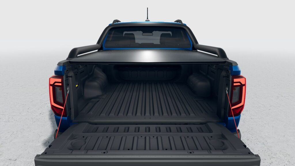 Edici Dark Label poznáte na první pohled: nese stejnojmenné označení na bočních dveřích, stojí na 20″ kolech z lehké slitiny v matně černém provedení a prakticky veškeré doplňky karoserie jsou laděny do černa – od předního nárazníku, masky chladiče a ochrany podvozku přes B-sloupky a podélné střešní nosiče až po boční schůdky, kliky dveří a kryty zpětných zrcátek. Zadní část zvýrazňuje černý nárazník, tmavě tónovaná zadní světla, matně černý rám a tmavé zadní okno. V Evropě lze Dark Label objednat ve třech tmavých metalických odstínech: černá Midnight, šedá Dark a modrá Bright. Na přední části nechybí ani výrazný znak V6.