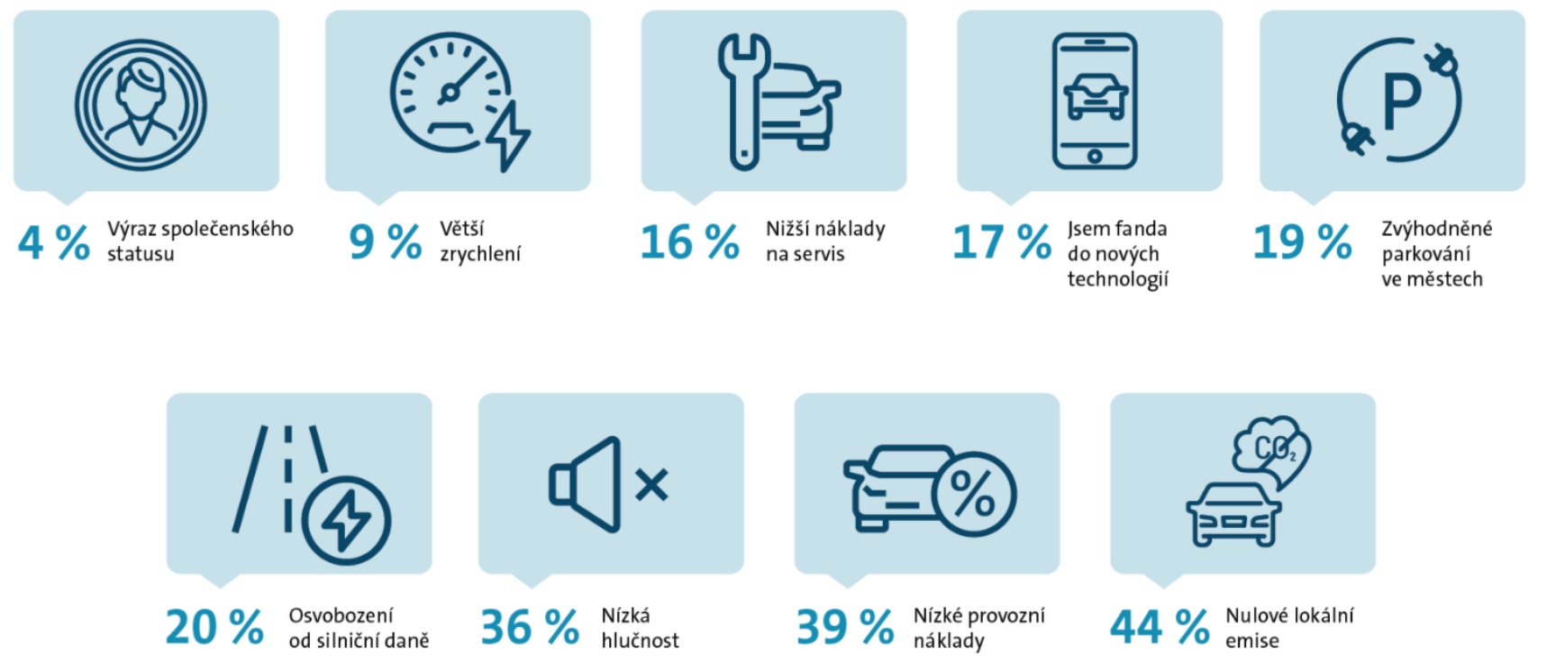 Důvodů pro pořízení elektromobilu je podle dotazovaných řidičů hned několik. Mezi nejčastěji zmiňovanými přednostmi najdeme nulové lokální emise, které hrají v rozhodování roli pro 44 % řidičů. Klíčovou vlastností jsou také nízké provozní náklady, které jsou důležité pro více než třetinu z nich. Naopak svižnější akcelerace nebo prestiž spojená s elektromobilitou jsou rozhodujícím faktorem pro každého dvacátého řidiče.