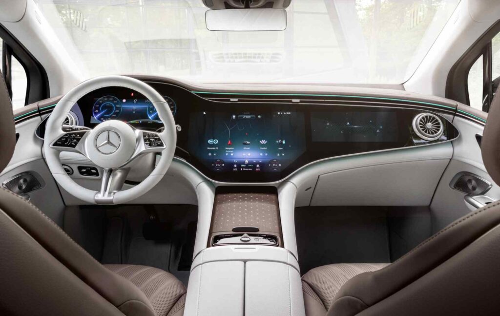 Dominantou interiéru je volitelně dodávaný systém MBUX Hyperscreen. U tzv. nulové vrstvy nemusí uživatel ani procházet nižšími úrovněmi menu, ani zadávat hlasové povely. Situačně a s ohledem na kontext jsou v nejvyšší úrovni zorného pole nabízeny aplikace. U systému MBUX Hyperscreen (volitelná výbava) vytvářejí tři displeje s téměř dokonale plynulými přechody zobrazovací plochu širokou více než 141 centimetrů. Spolujezdec vpředu má v modelu EQE SUV k dispozici volitelně dodávaný 12,3“ displej OLED. Systém používá inteligentní kamerový systém, který rozpozná, zda se řidič dívá na displej spolujezdce vpředu. V tomto případě systém z bezpečnostních důvodů automaticky ztlumí dynamické obsahy. Standardní interiér Electric Art se obejde kompletně bez kůže.