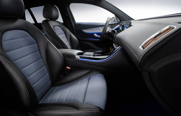 EQC je průkopníkem avantgardní elektromobilové estetiky také v interiéru. Příkladem je „lamelový límec“ přístrojové desky, který připomíná chladicí žebra některých zesilovačů Hi-Fi. Přístrojová deska je koncipována jako „kokpit“ zaměřený na řidiče. Pro Mercedes-Benz typický profil křídla je asymetrický a v oblasti řidiče „vyříznutý“. V této části se nachází jeden z vizuálně nejpřitažlivějších prvků „kokpitu“ – technicky pojatý panel s lesklou povrchovou úpravou, v němž jsou uloženy nízké výdechy ventilační soustavy s nevšedně tvarovanými lamelami v odstínu růžového zlata.
