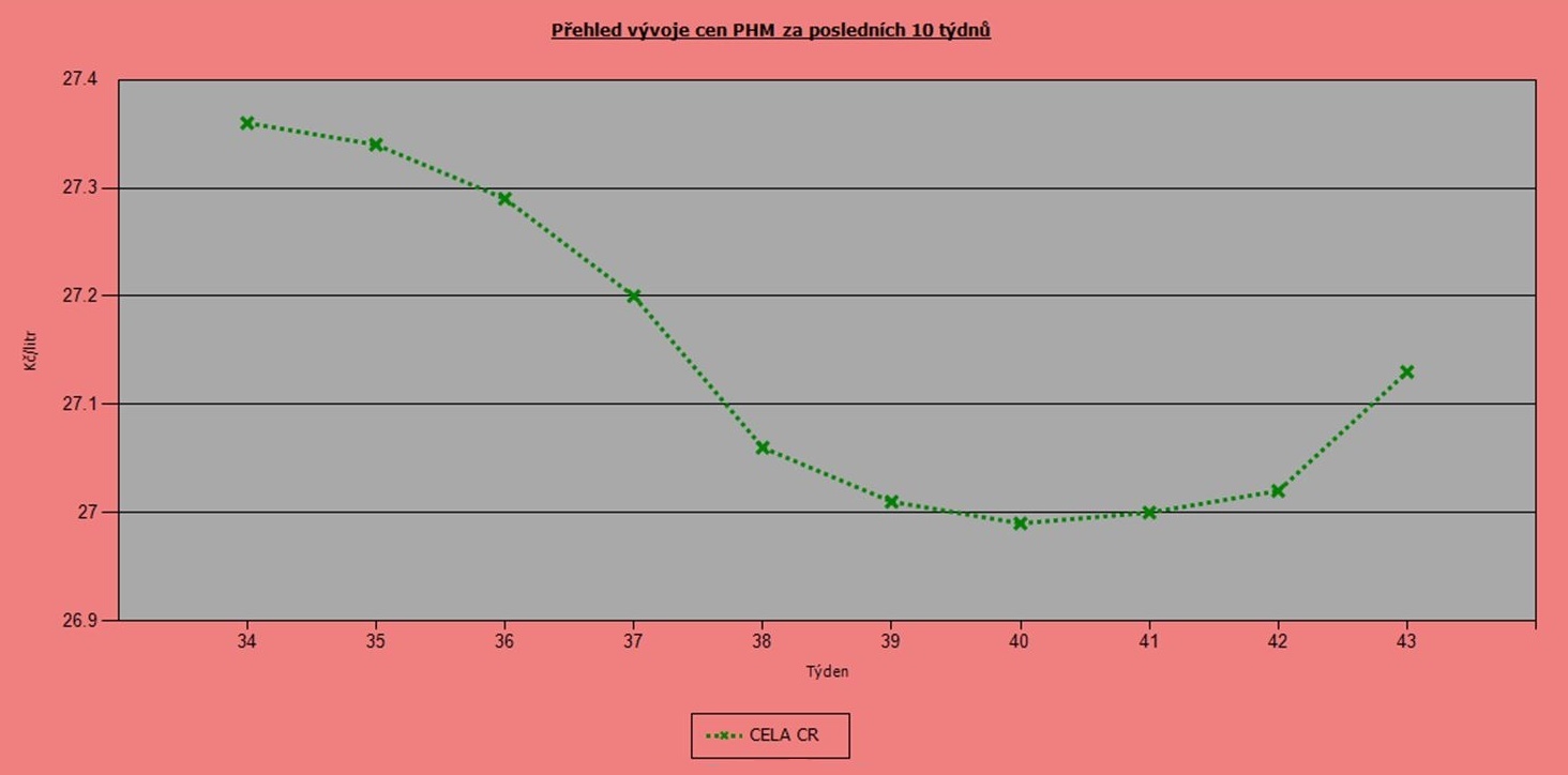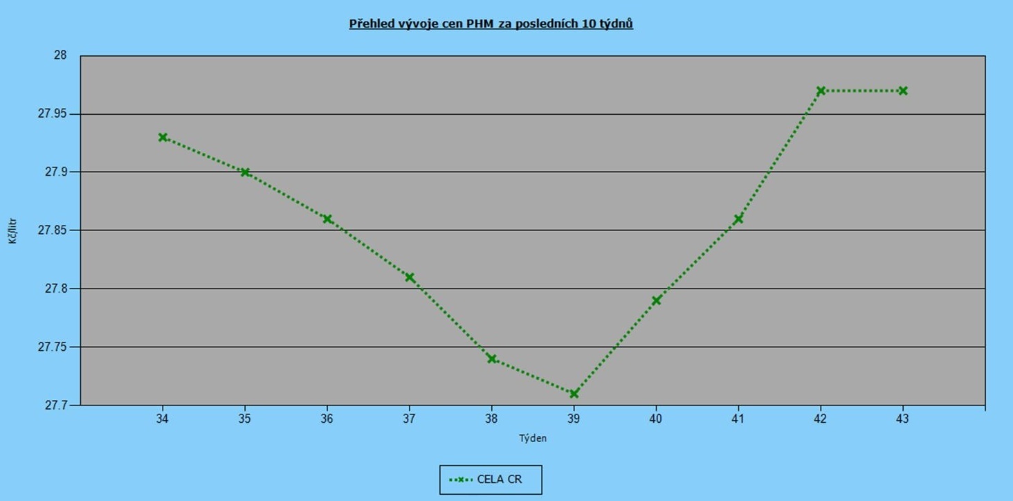 Po sezónních výkyvech se cena pohonných hmot stabilizovala a nadále zůstává pro motoristy příjemná. Celorepublikový průměr Naturalu 95 se v posledních deseti týdnech zvýšil o 5 haléřů na 27,97 Kč/l. Nafta naopak zlevnila o 23 haléřů na 27,13 Kč/l.
