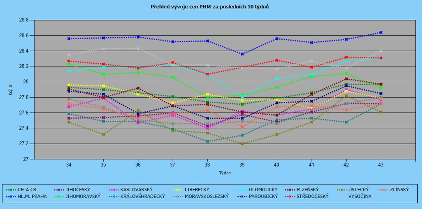 Naftu za příznivé ceny natankujete opět v Ústeckém (26,51 Kč/l) a Královéhradeckém kraji (26,75 Kč/l). Hranici 28 Kč/l prolomilo hlavní město Praha (26,75 Kč/l) a hned po něm je nejvyšší cena ve Středočeském kraji (27,66 Kč/l).