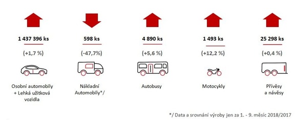 Po započtení produkce přípojných vozidel k počtu motorových vozidel je celkový počet silničních vozidel vyrobených v roce 2018 v ČR, rekordních 1 469 675 kusů, což je meziroční nárůst 1,6 %.