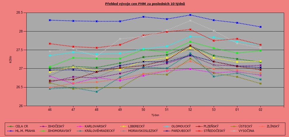 Jedině v Praze se cena nafty přehoupla přes 28 korun na 28,12 Kč/l. Doporučujeme se také vyhnout Středočeskému a Olomouckému kraji, kde je shodná cena 27,64 Kč/l. Dotankovat naftu je vhodné ponechat na průjezd Ústeckým (26,60 Kč/l) a Karlovarským (26,71 Kč/l)krajem