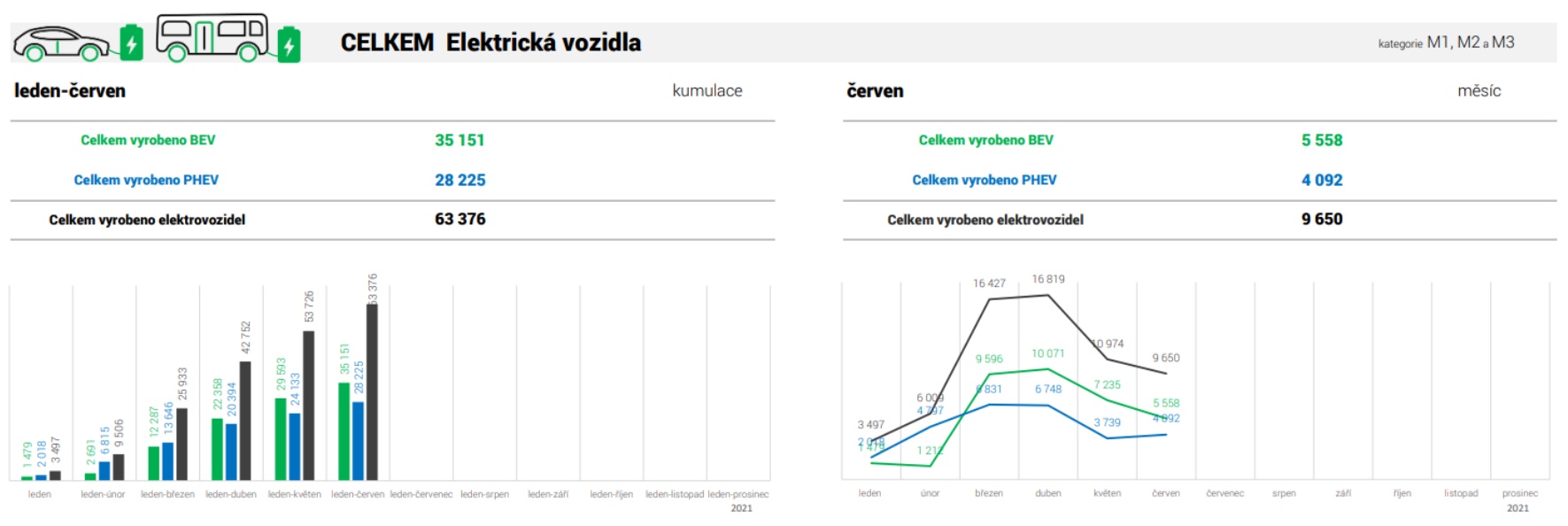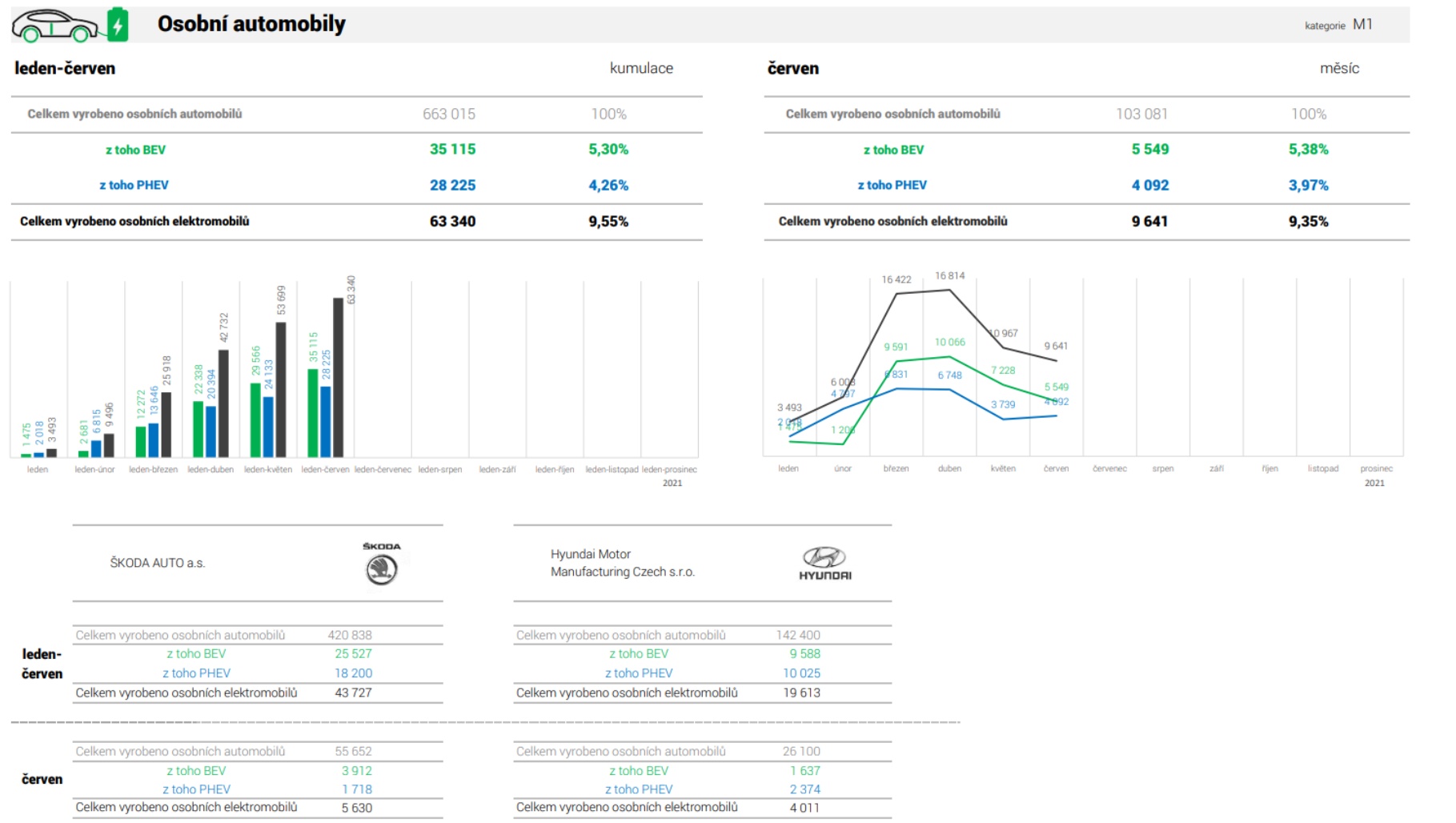 Z celkového počtu vyrobených osobních vozidel bylo celkem 63 340 ks elektrických; to odpovídá podílu na celkové produkci ve výši 9,6 %. Bateriových elektromobilů bylo vyrobeno 35 115 ks (tj. 5,3 %), plug-in hybridů (PHEV) 28 225 ks (tj. 4,3 %). Škoda Auto mezi lednem a červnem vyrobila 25 527 BEV a 18 200 PHEV, Hyundai 9 588 BEV a 10 025 PHEV.