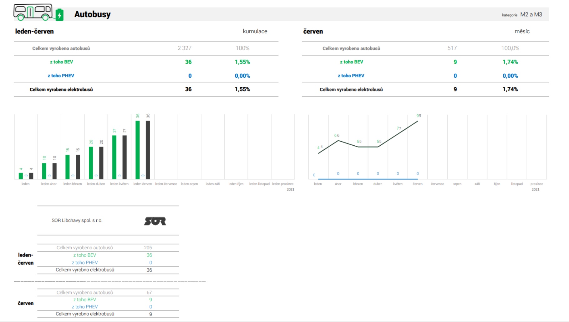 V prvním pololetí bylo v Česku vyrobeno 2 327 autobusů (+ 4,3 %), 337 autobusů bylo určeno pro tuzemský trh (- 16,2 %), zbývajících 1 959 bylo exportováno (+ 9,5 %). Ve vysokomýtském Iveco CR bylo vyrobeno 2 113 autobusů, tedy o 5,7 % více než v loňském roce. SOR Libchavy dokázal v první polovině tohoto roku vyrobit 205 autobusů (- 8,1 %), z toho 36 ks bylo s elektrickým pohonem (tj. podíl 17,6 %). Výrobce KHMC Opava v tomto roce vyrobil 9 autobusů, tedy stejně jako v loňském roce.