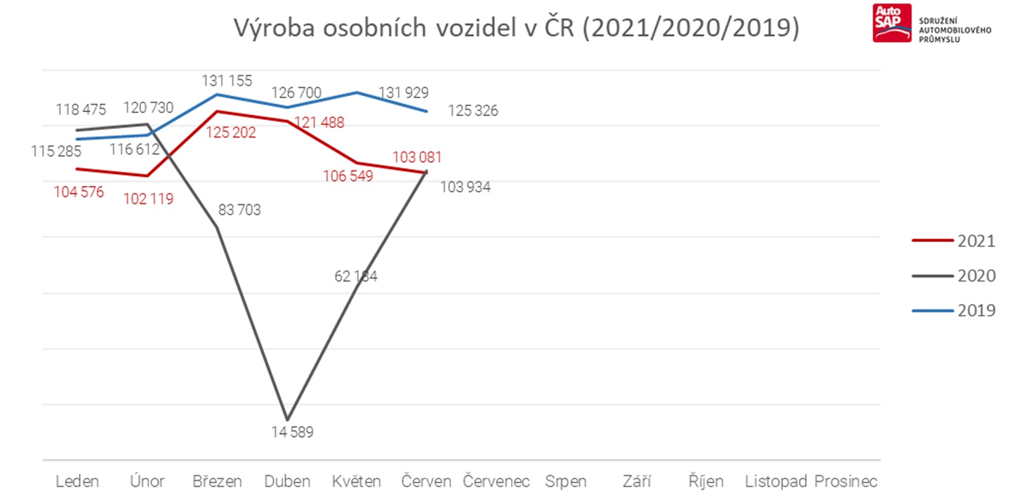 Po slibném začátku roku začala produkce vozidel v Česku ztrácet tempo. Na vině je především nedostatek čipů potřebných pro výrobu osobních automobilů i slabší poptávka na hlavních trzích EU. V první polovině roku bylo vyrobeno celkově 663 015 automobilů. To je sice meziročně o 31,7 % vozidel více, avšak ve srovnání s předkrizovým rokem 2019 stále o 11,2 % méně. Do výroby se promítly výpadky dílů a vynucené odstávky v květnu a červnu. Produkce elektrických vozidel nadále tvoří zhruba desetinu celkové produkce.