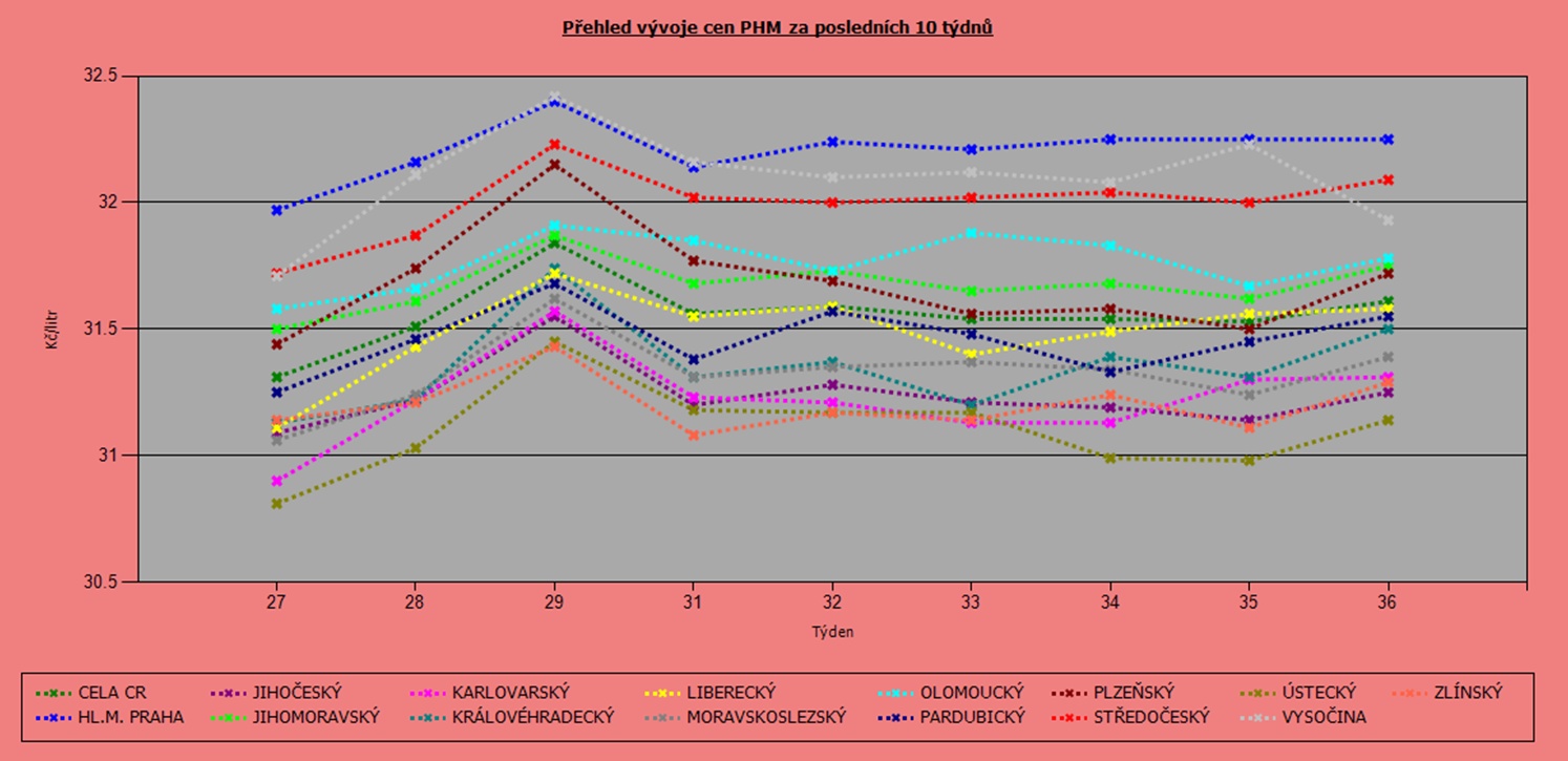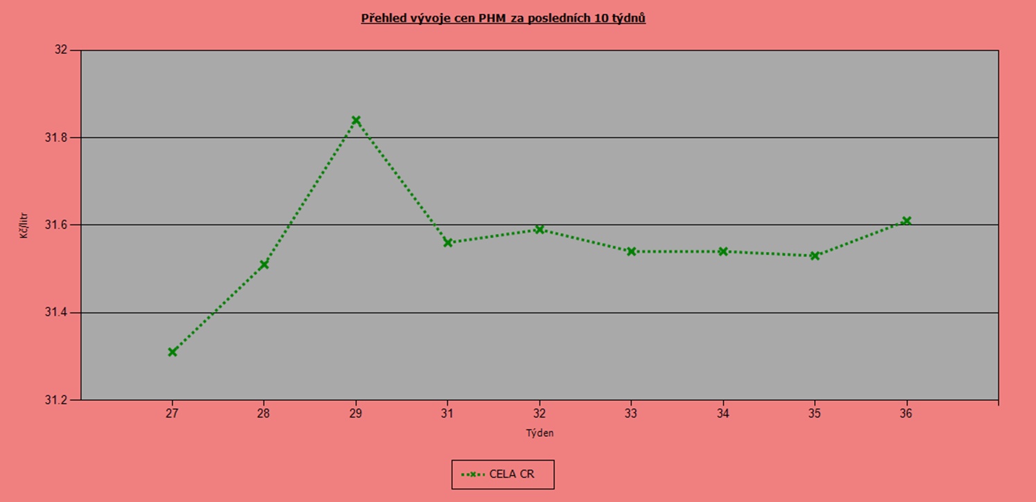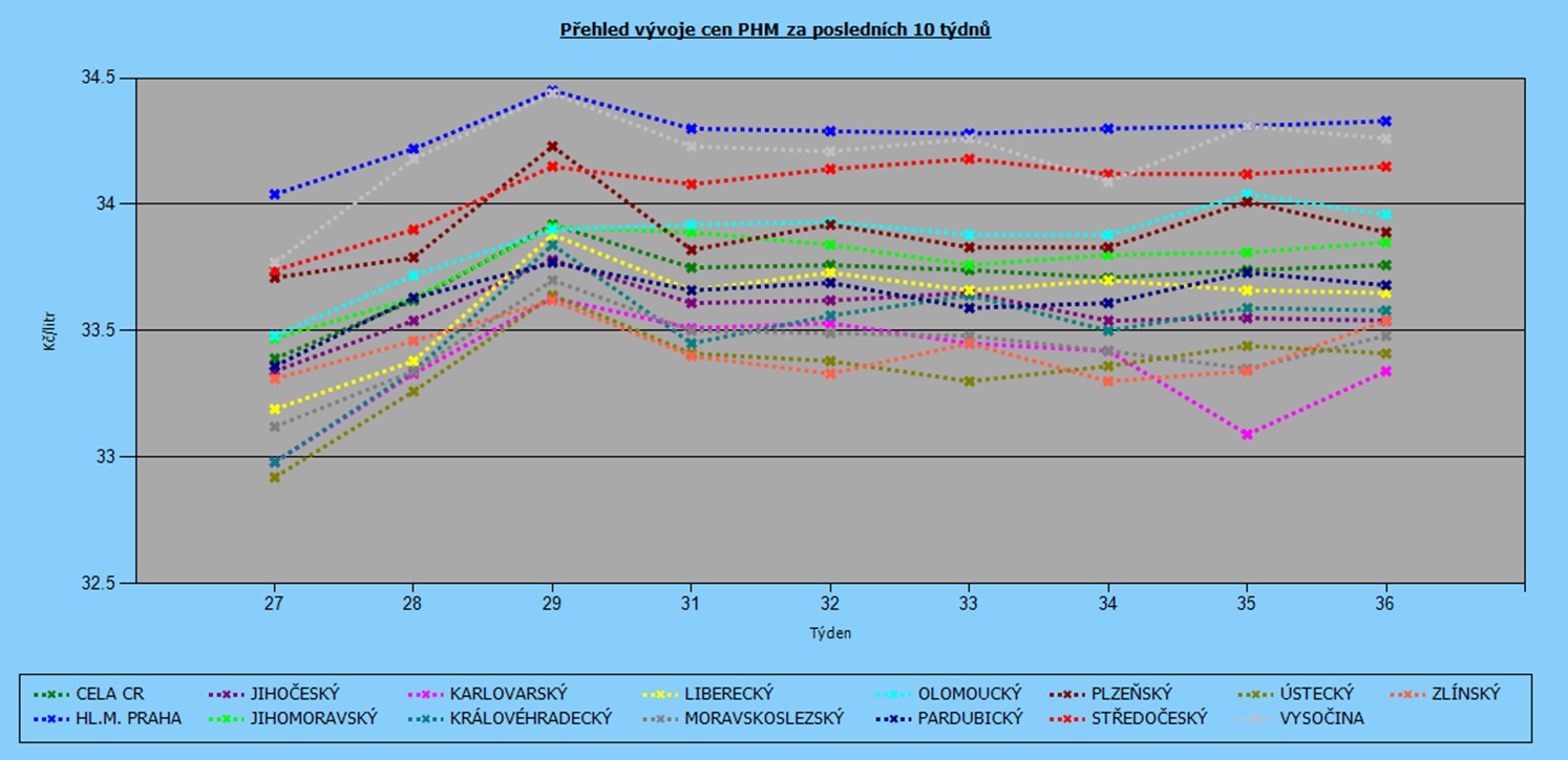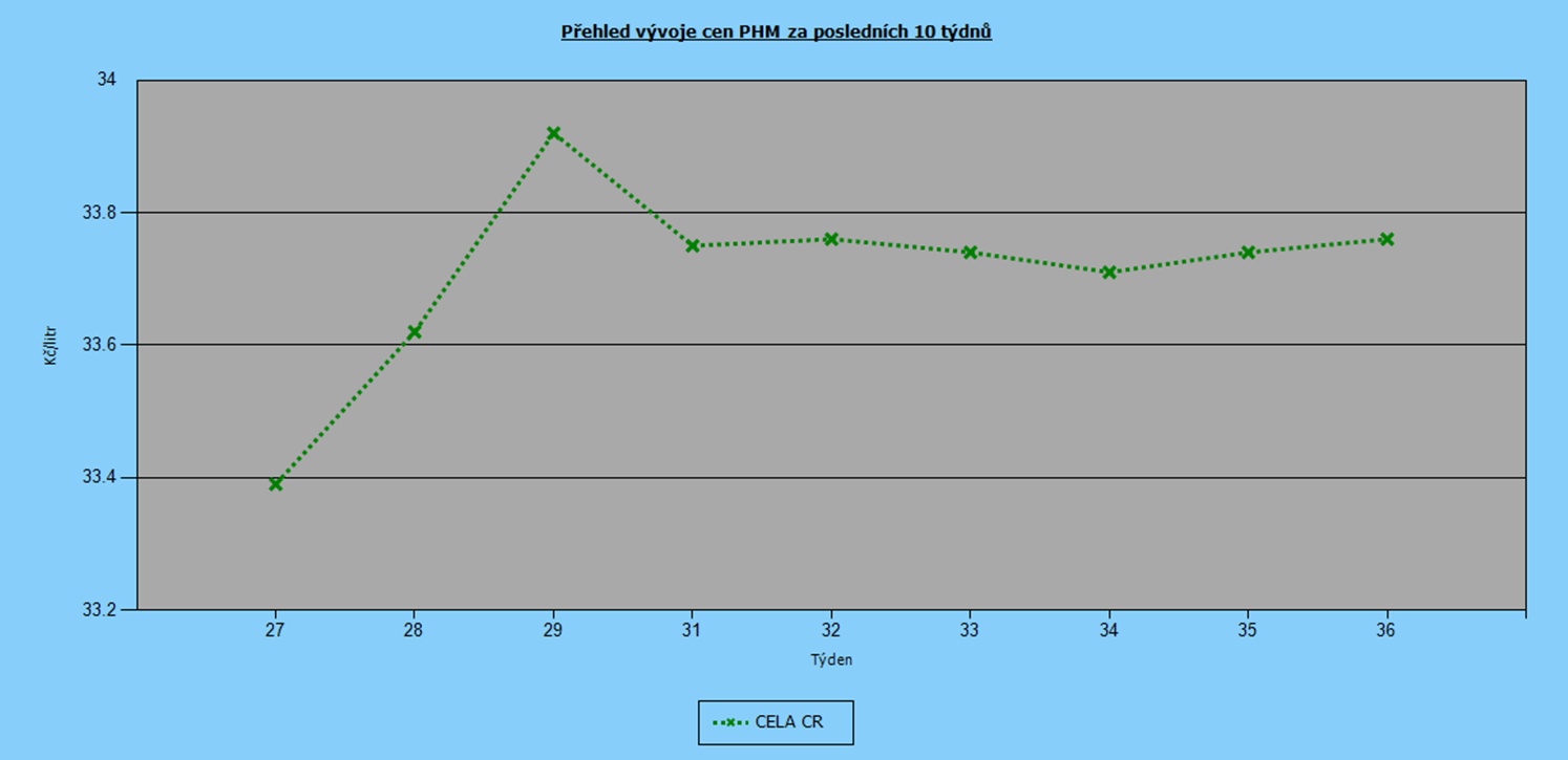 Už od začátku června se ceny pohonných hmot stabilizovaly a výkyvy se pohybovaly jen v rozmezí 50 haléřů. V posledních dvou týdnech zdražil natural 95 v průměru o dva haléře na 33,76 Kč/l. Nafta poskočila o osm haléřů na 31,61 Kč/l.