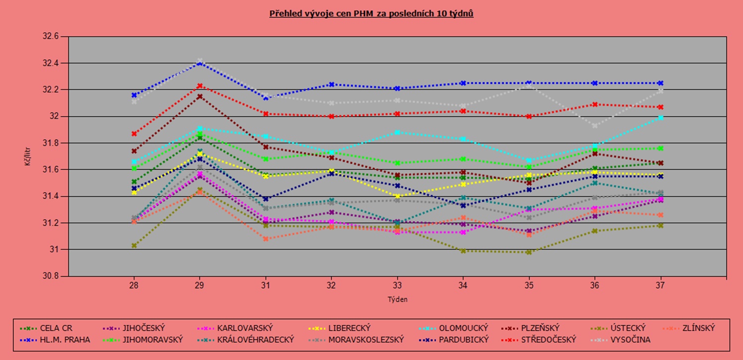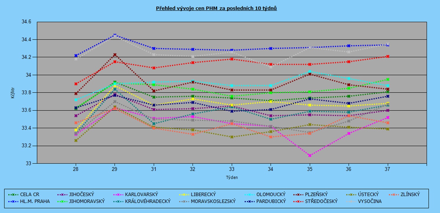 Již tradičně si lidé řádně připlatí při tankování v Praze, kde cena Naturalu 95 činí v průměru 34,34 Kč/l, nafty pak 32,25 Kč/l. Druhým nejdražším krajem je Vysočina s cenou benzínu 34,21 Kč/l a nafty 32,19 Kč/l.