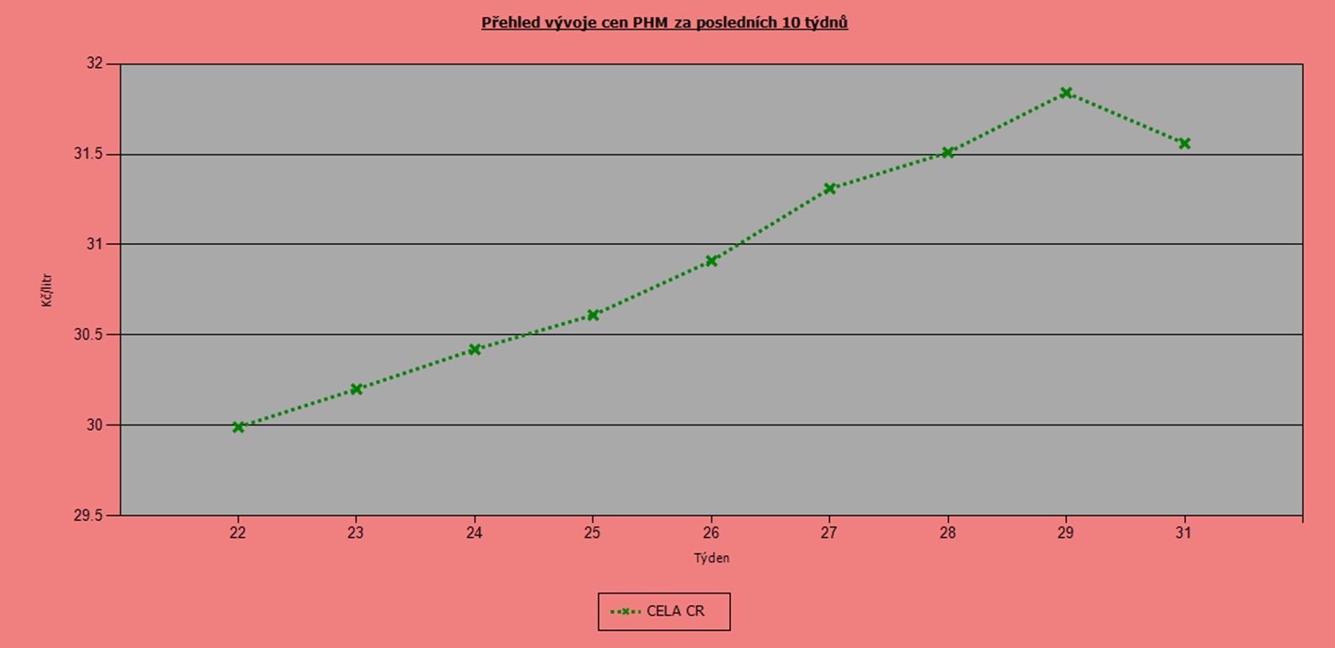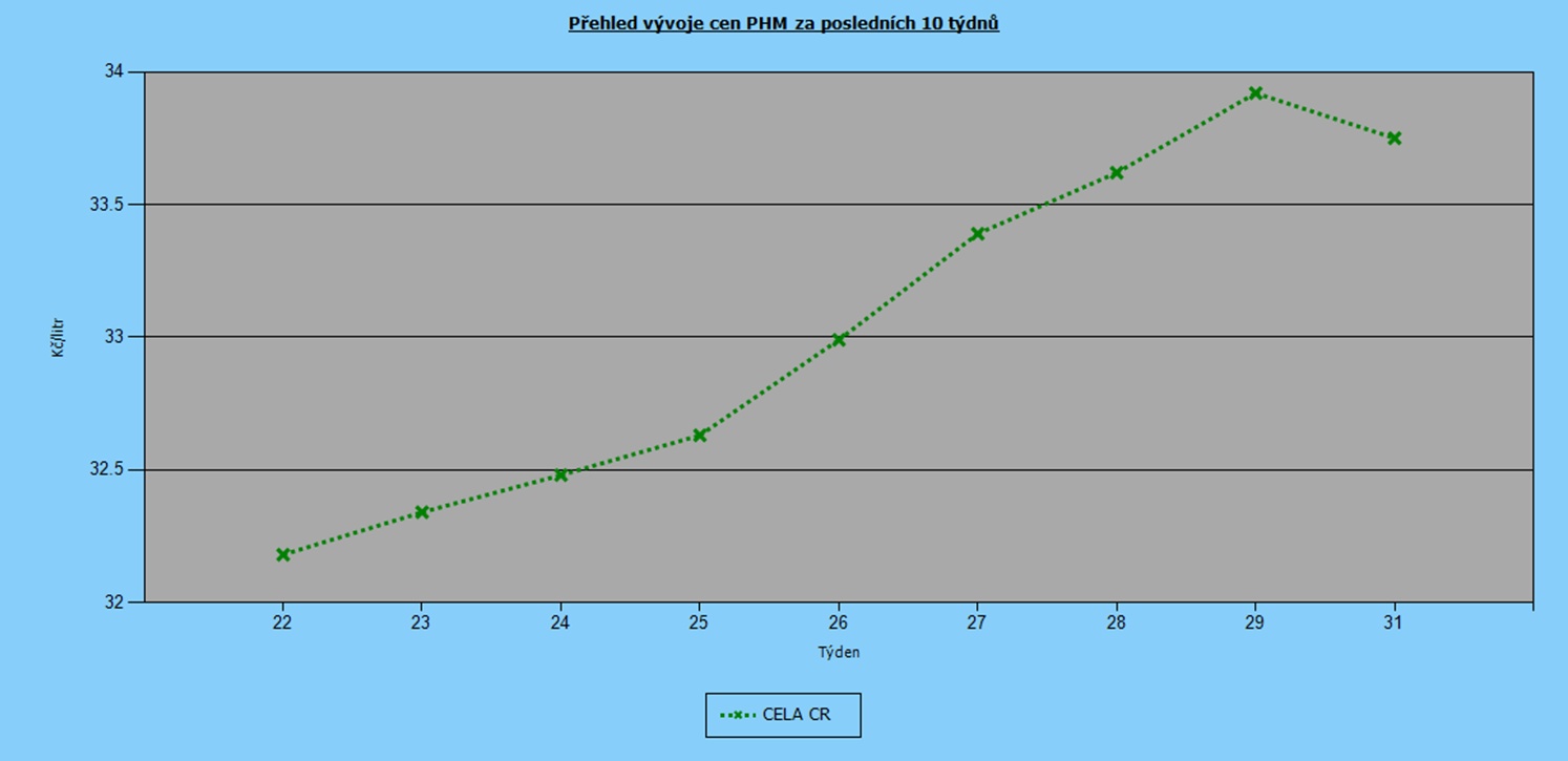 Po velmi příznivých cenách na jaře tohoto roku přišlo výrazné zdražování pohonných hmot. Přehled posledních týdnů však ukazuje na lepší časy. Za poslední týden cenová hladina v případě Naturalu 95 klesla o 36 haléřů na 33,39 Kč/l, u nafty pak o 25 haléřů na 31,31 Kč/l.