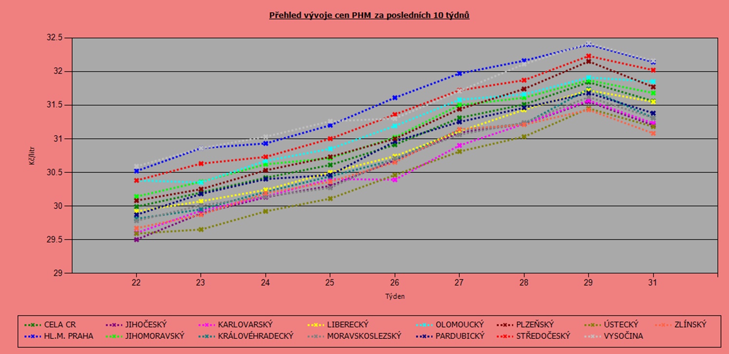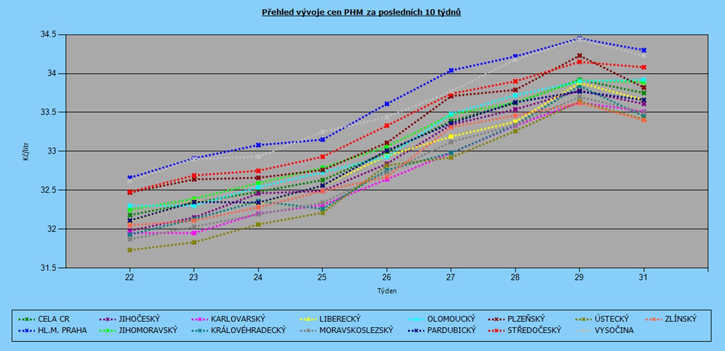 Nejdražším krajem nadále zůstává Praha, kde průměr jako jediný překonal hranici 34 korun (34,04 Kč/l). Hned za ní je Středočeský kraj (33,74 Kč/l). Dlouhodobě nejlevněji tankují řidiči v Ústeckém kraji (32,92 Kč/l), dále pak v Karlovarském a Královéhradeckém kraji, kde je stejný průměr (32,98 Kč/l).