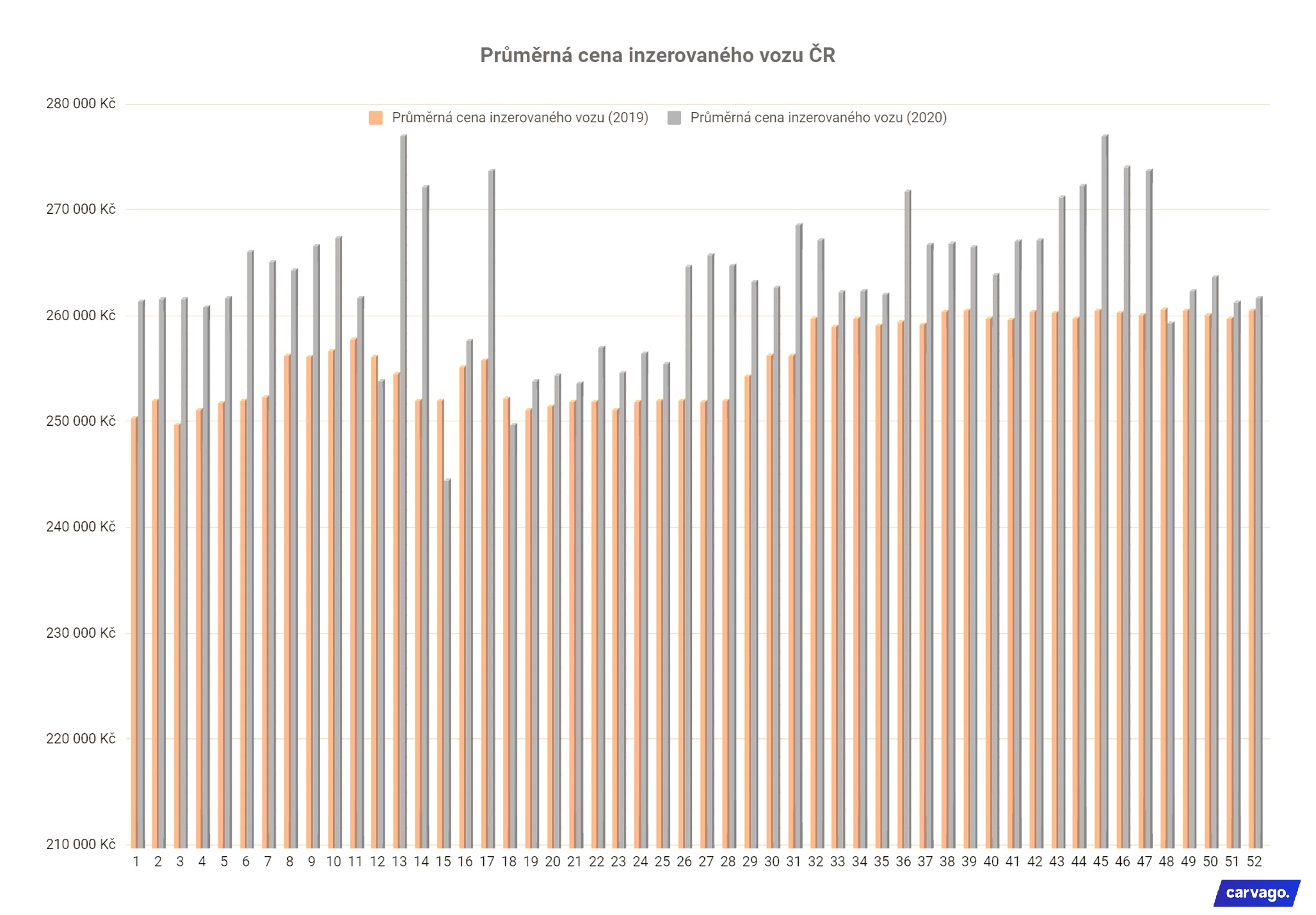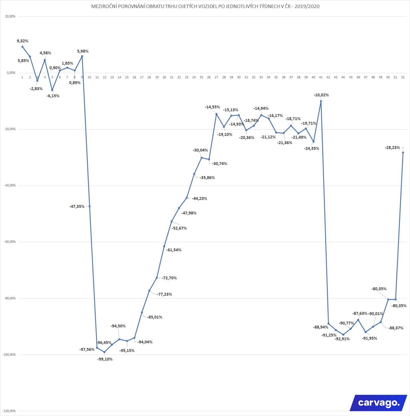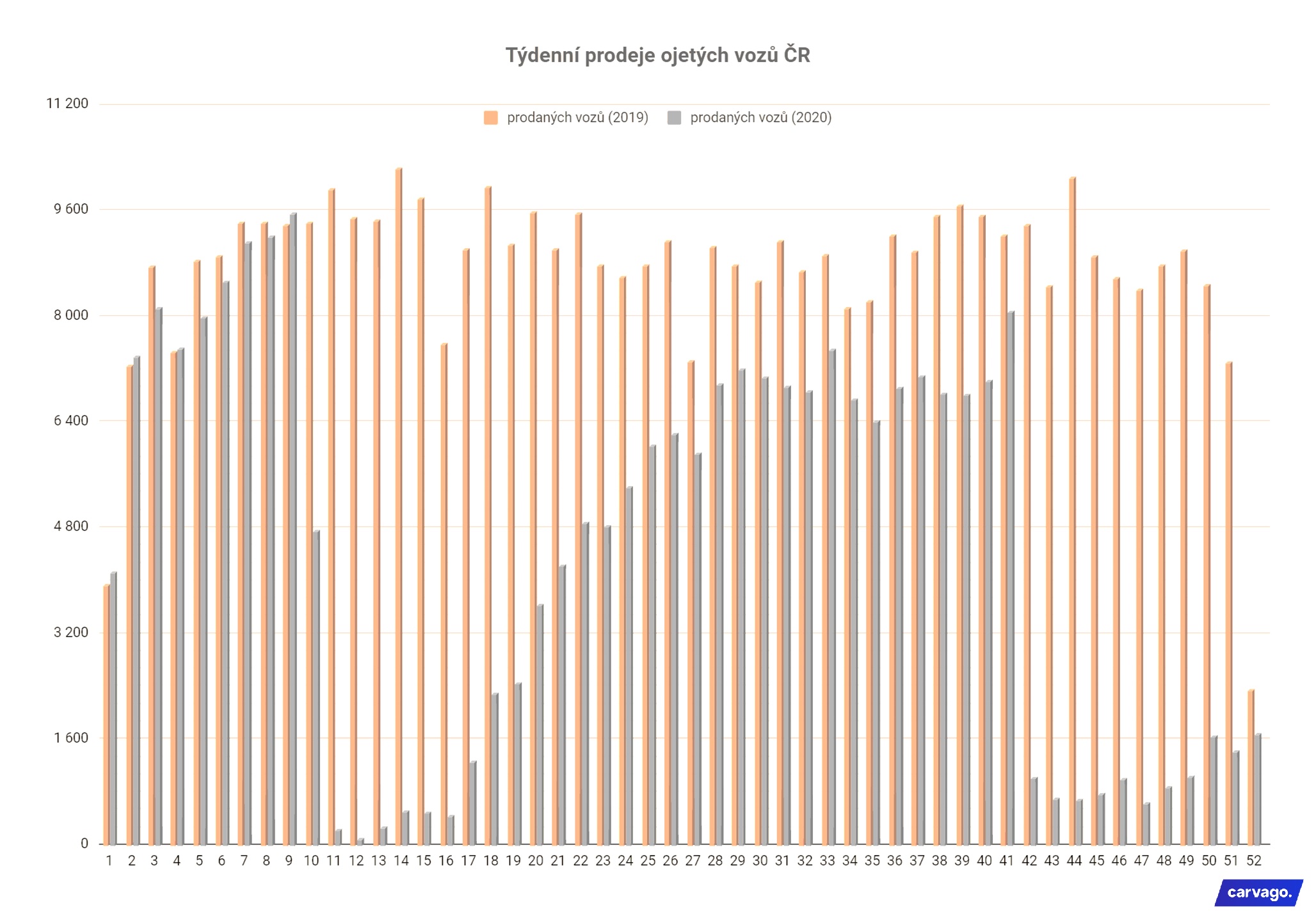 Trh ojetých vozů zaznamenal v rámci meziročního srovnání propad obratu o 53,6 miliard korun a celkově se prodalo o 47 % méně ojetých automobilů. Důsledkem pandemie koronaviru je také nárůst průměrné ceny ojetin o 3 % a vzestup online prodeje, který během podzimního lockdownu pomohl zmírnit propad obratu o více než 1 miliardu korun. Vyplývá to z datových analýz online autotržiště Carvago, spadajícího do skupiny European Automotive Group (EAG). V loňském roce byly nejžádanější vozy nižší střední třídy a průměrné stáří bylo 10,5 roku.