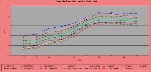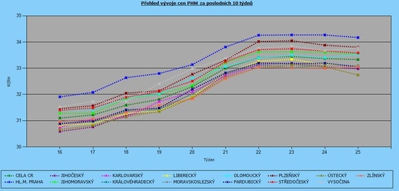 S posledními školními dny přichází čas prázdnin a dovolených. Od minulého shrnutí cen pohonných hmot, vázaného k 22. týdnu, v České republice hladina mírně klesla, ovšem rozdíly jsou v řádu haléřů. Nejdražší Natural 95 je stále v Praze (34,17 Kč/l) a Plzenském kraji (33,80 Kč/l). Tankovat se potom vyplatí v Ústeckém (32,74 Kč/l) a Jihočeském kraji (32,98 Kč/l). Celostátní průměr Naturalu 95 je 33,33 Kč/l.