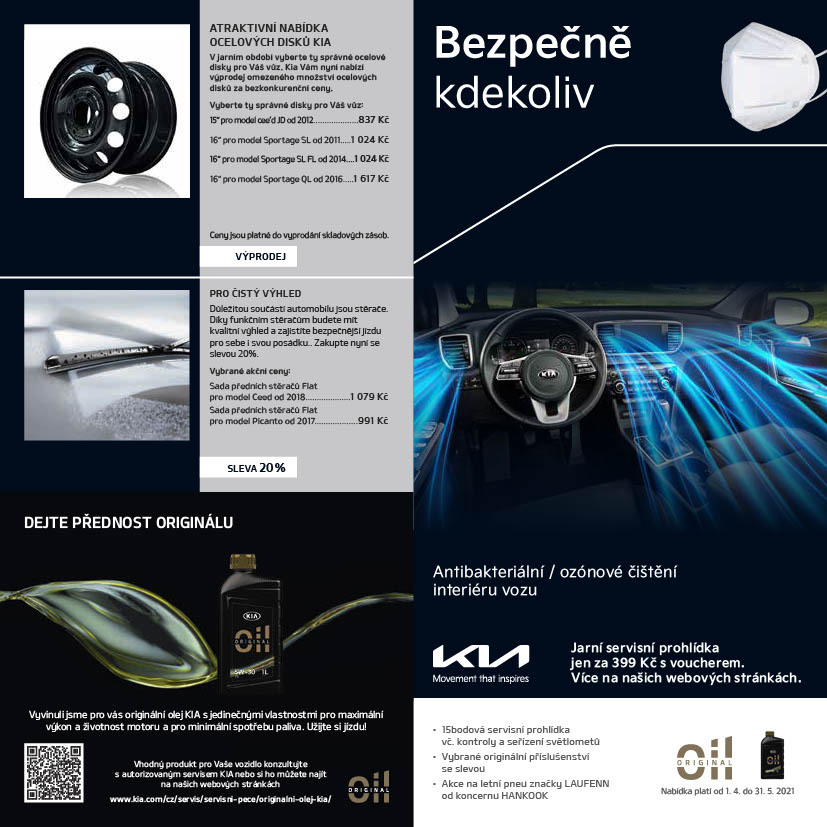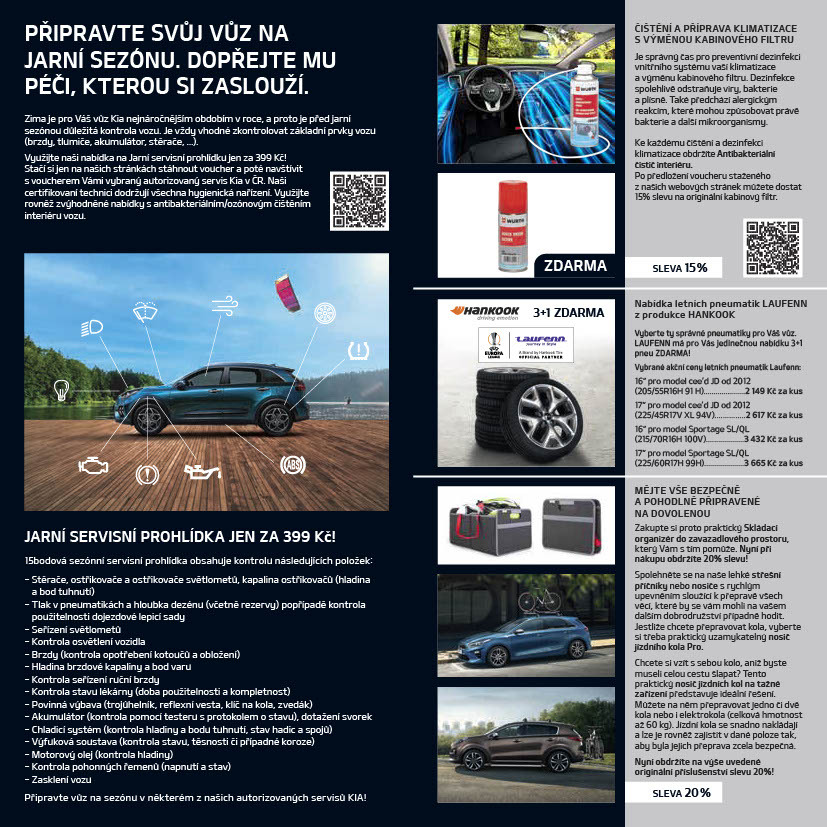 Majitelé vozů Kia si až do konce května mohou nechat prohlédnout své auto v autorizovaném servisu v rámci Jarní servisní akce. Její hlavní součástí je zvýhodněná cena pro kontrolu 15 klíčových parametrů, které ovlivňují bezpečnost jízdy a spolehlivost vozů včetně seřízení předních světlometů. Pokud si zákazníci stáhnou elektronický voucher ze stránek www.kia.cz, zaplatí za celou prohlídku jen 399 Kč. Navíc mohou získat slevu na některé doplňky, případně využít akčních cen na nákup pneumatik a ocelových disků.