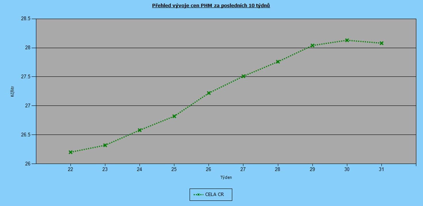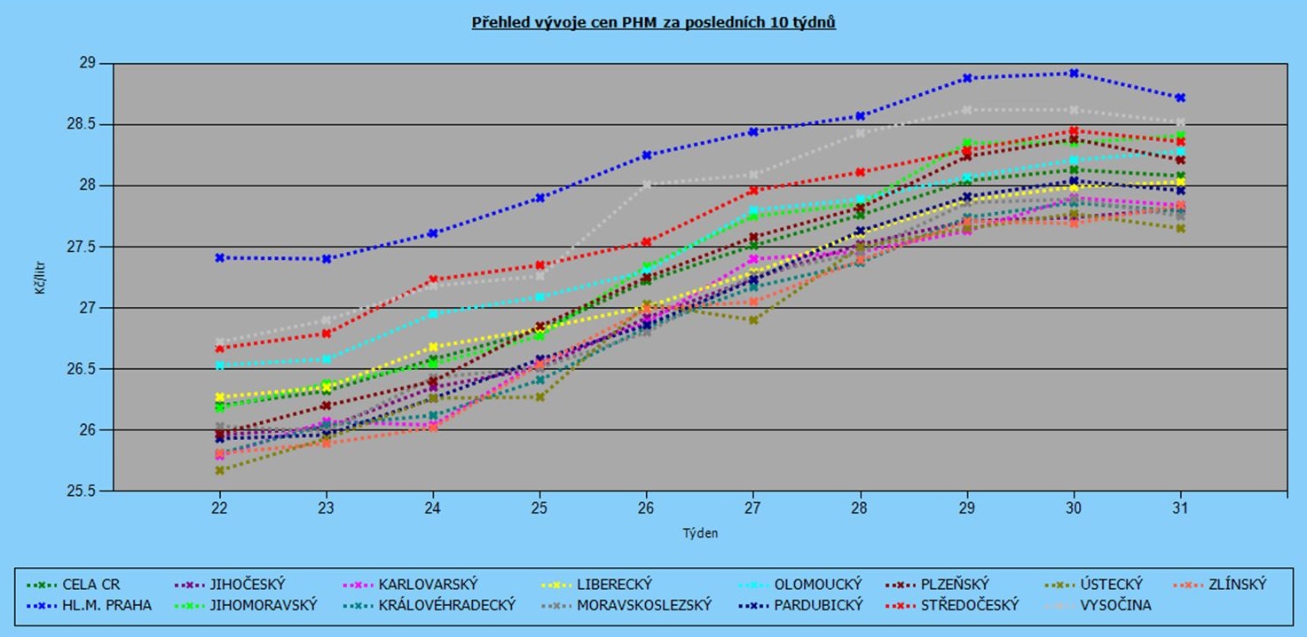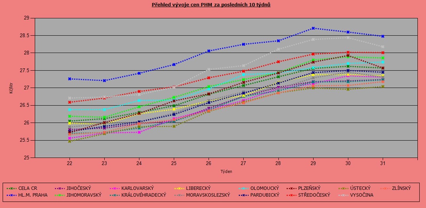 | 31. týden | 27,79 | 28,03 | 27,75 | 28,28 | 27,96 |