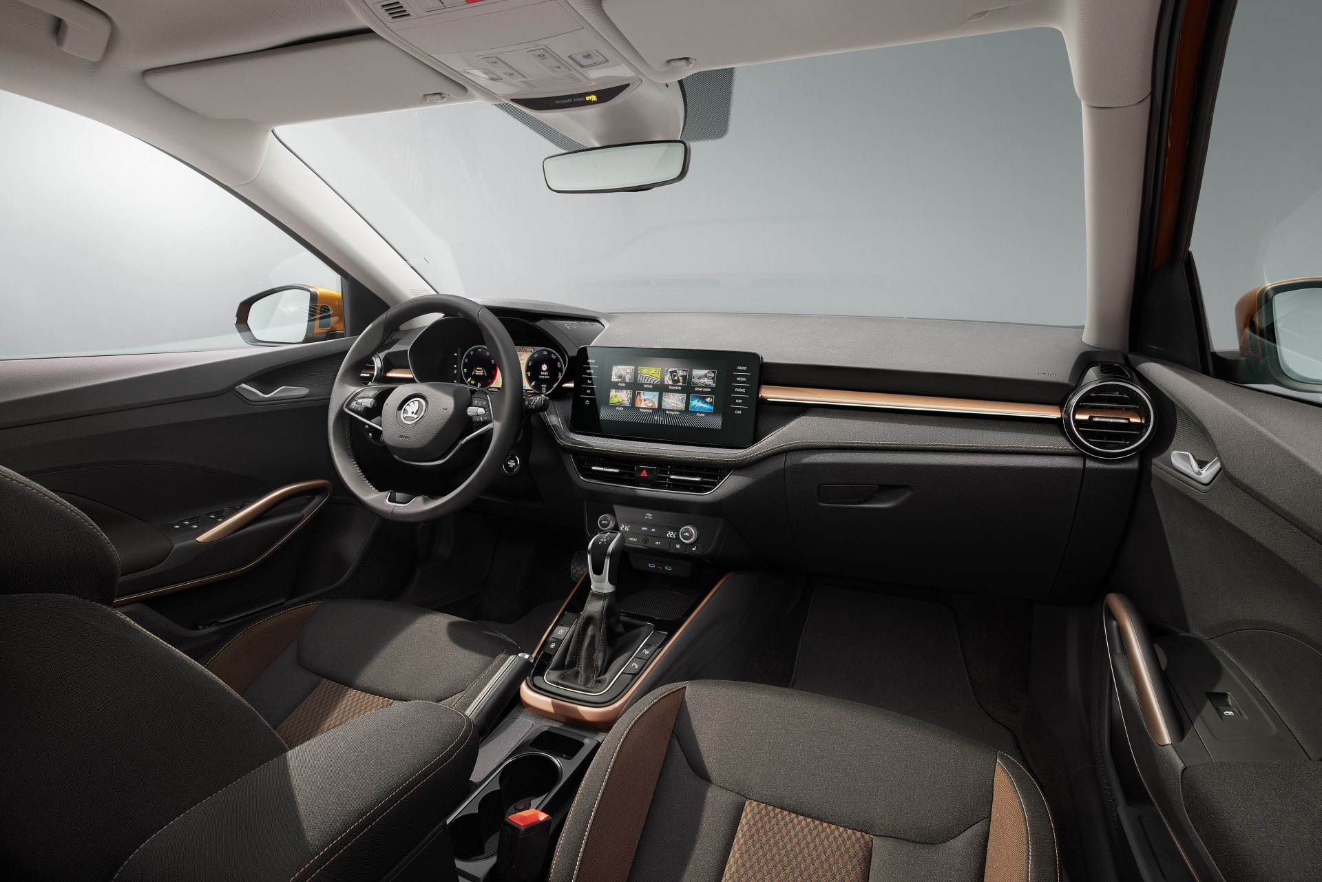 Design interiéru završují volanty v novém designu. Kožený multifunkční volant a tříramenný sportovní multifunkční volant s pádly pro vozidla vybavená DSG jsou nabízeny na přání, stejně jako vyhřívaný volant a vyhřívané čelní sklo. Poprvé je v modelu Fabia k dispozici na přání digitální přístrojový panel s 10,25″ displejem. Druhou premiéru slaví dvouzónová klimatizace.