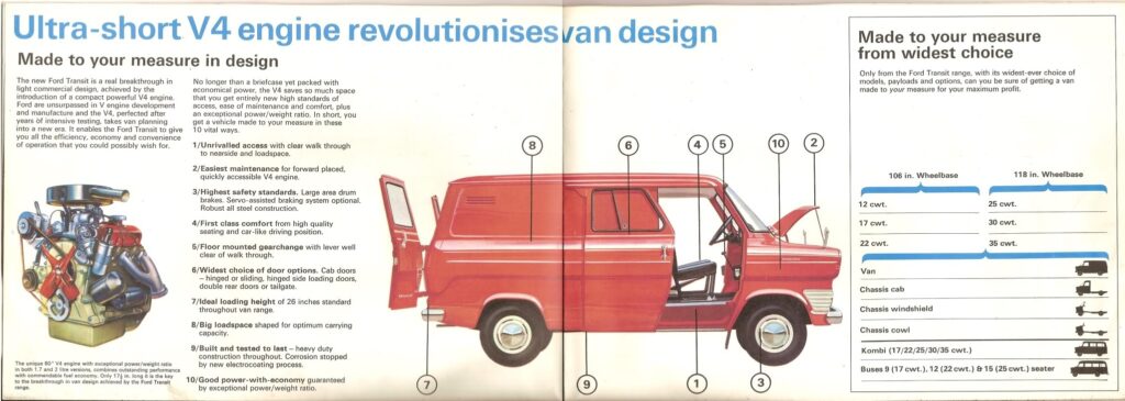 Současná nabídka zahrnuje přes 1 300 variant dvoutunového Transitu – od různých karoserií, délek a výšek přes rozmanité pohonné jednotky až po výbavové úrovně. A to ještě před volbou barvy a doplňků. Zatímco první generace Mk1 zvládla užitečné zatížení 1 700 kg, dnešní verze Van utáhne více než 2 400 kg. Největší provedení L4 H3 nabízí nákladový prostor 15,1 m³ – tedy místo pro zhruba 236 000 pingpongových míčků.