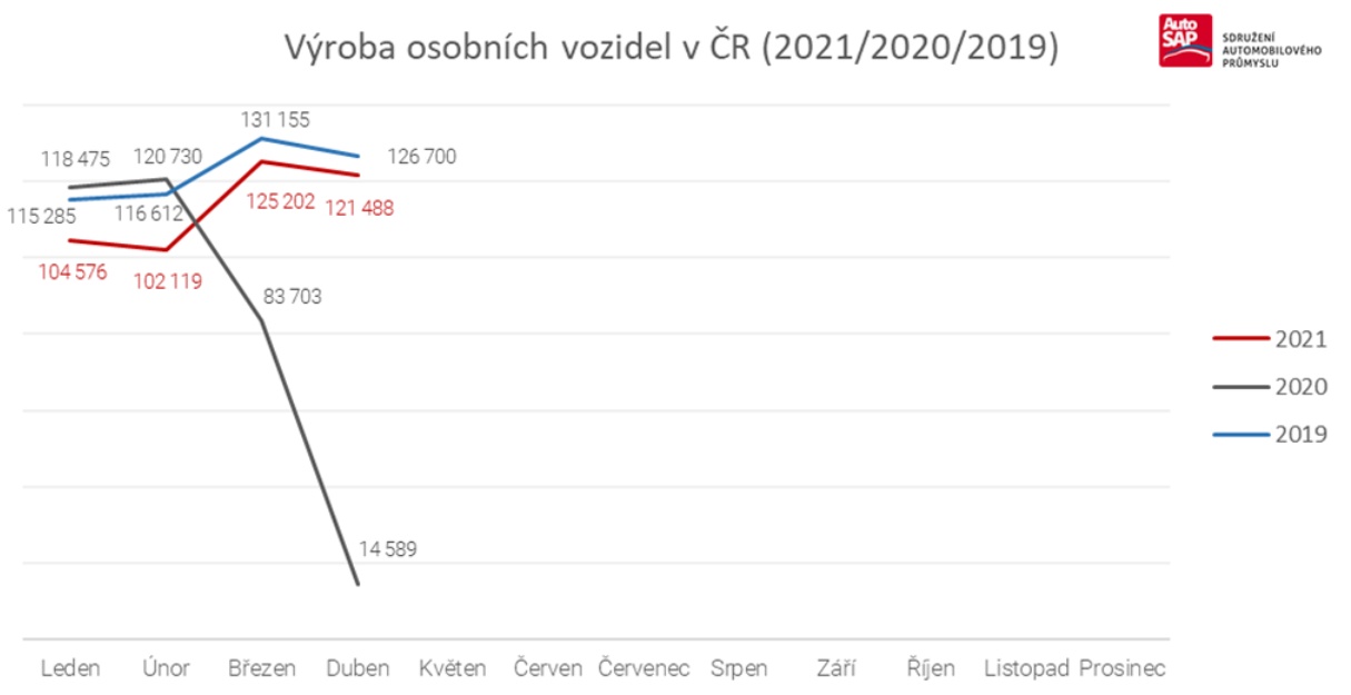 Od ledna do dubna bylo v Česku vyrobeno celkově 453 385 osobních vozidel (+ 34,3 %), 1 424 autobusů (+ 7,2 %) a 361 motocyklů (+ 167,4 %). V meziročním srovnání je však zapotřebí zohlednit fakt, že v loňském roce se výroba ve druhé polovině března a v dubnu až na několik výjimek prakticky zastavila.