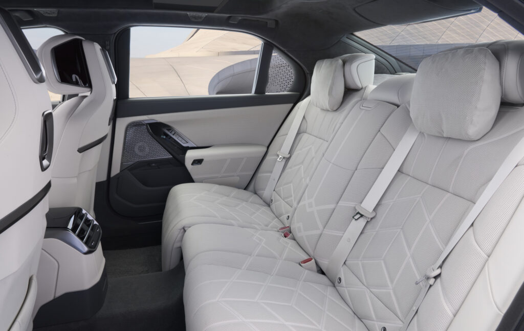 BMW přidalo také méně viditelné úpravy, které jsou pro luxusní sedan podstatné. Akustiku zlepšuje akustické zasklení, lepší izolace dveří, upravené kryty vnějších zrcátek a pneumatiky s pěnovými tlumiči. Materiálová skladba zůstává široká. V kabině může být dřevo, kůže, textilie, kov, Alcantara, karbon i křišťálové ovládací prvky CraftedClarity na voliči převodovky, startovacím tlačítku a ovladači hlasitosti. Standardem je čalounění Veganza, výš stojí kůže BMW Individual Merino a vrcholem je kombinace Merina a kašmírové vlny. BMW uvádí zhruba 700 kombinací materiálů, barev a povrchů.