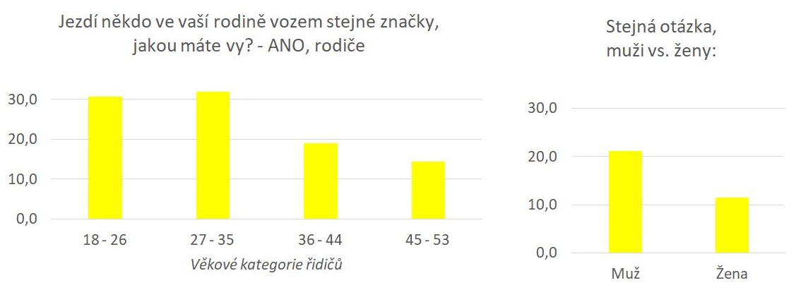Zajímavé je, že data ukázala větší podobnost mezi rodiči a dětmi, než mezi partnery. Jen asi ve 13 % domácností jezdí oba partneři autem stejné značky, a to napříč všemi věkovými kategoriemi. Platí přitom, že se výrazněji projevuje „rodinná značka“ muže než ženy. 21 % mužů uvedlo, že aktuálně jezdí stejnou značku auta jako jejich rodiče, v případě žen to platí jen asi v 11 % případů.