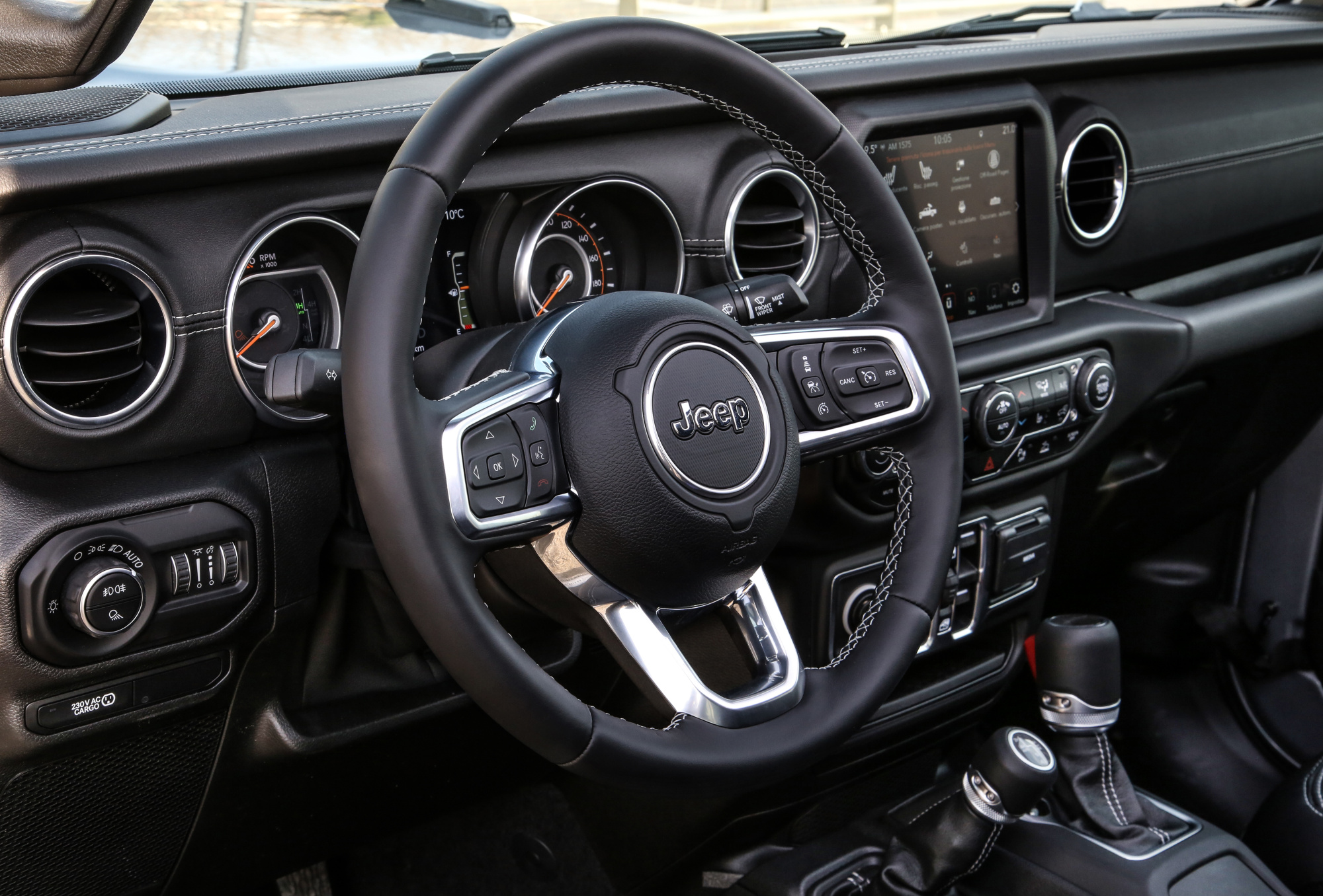 Kabina je vybavena černými koženými sedadly s oranžovým prošíváním a logem 80th Anniversary, které dále vylepšují velkoryse vybavený interiér. Standardní technologie a bezpečnostní prvky zahrnují audio systém Alpine s 9 reproduktory, subwooferem a výkonem 552 W, systém Uconnect 8.4 NAV s 8,4palcovou dotykovou obrazovkou a zrcadlením chytrého telefonu, monitoring mrtvého úhlu, detekci křížení dráhy za vozidlem a bezklíčový vstup a startování. Součástí standardní výbavy jsou rovněž specifické berberové koberečky a prémiový strop. Nový Gladiator 80th Anniversary je poháněn výkonným vznětovým motorem 3.0 MultiJet V-6 o výkonu 264 k a točivém momentu 600 Nm v kombinaci s osmistupňovou automatickou převodovkou.