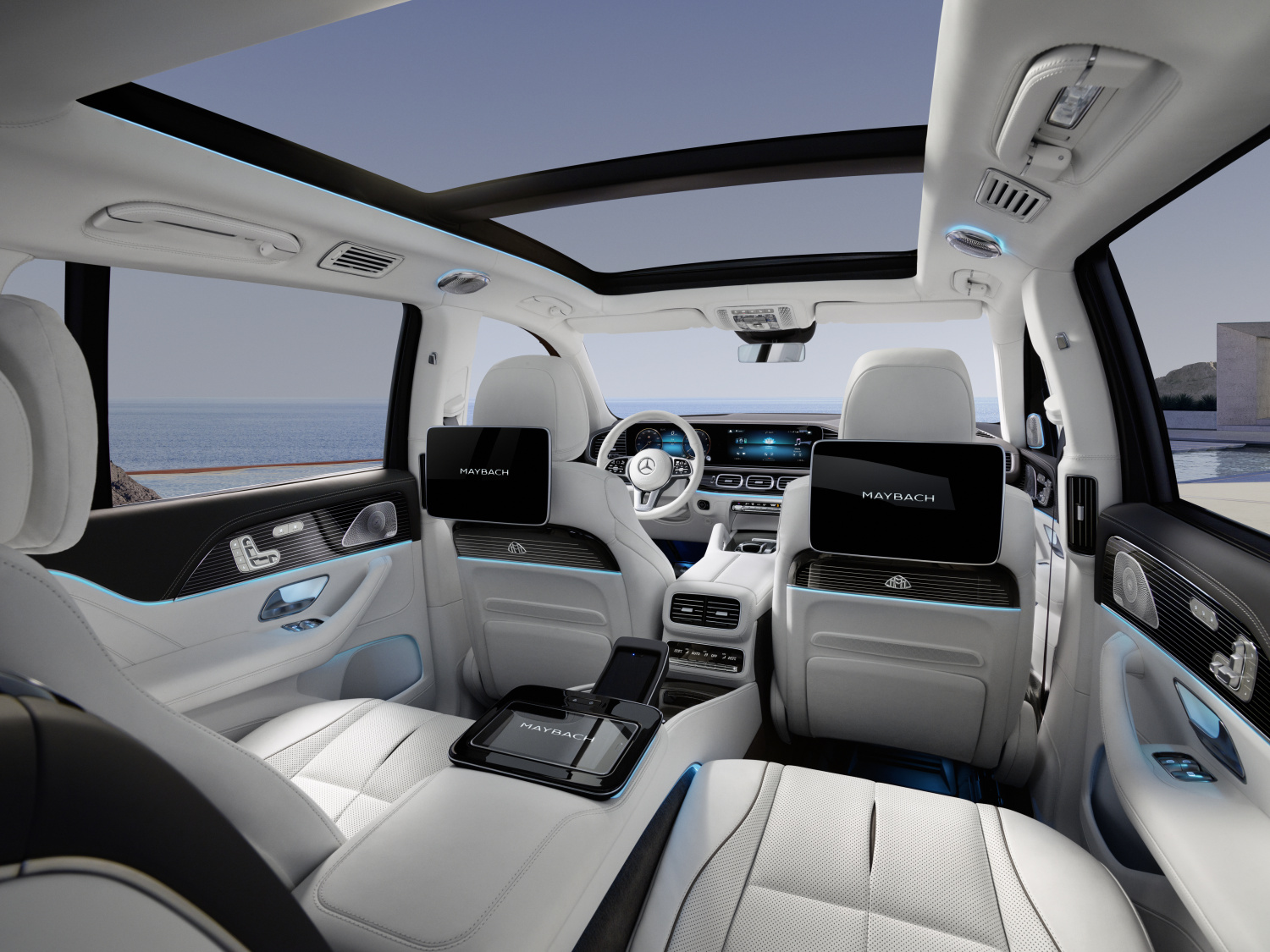 Interiérový asistent MBUX vzadu (pro Českou republiku součástí standardní výbavy) dokáže rozpoznávat cestující na zadních sedadlech, a podle toho vydá pokyn k automatickému vysunutí opěrek hlavy. Intuitivními pohyby ruky lze navíc ovládat zadní sluneční roletu v panoramatickém posuvném střešním okně. Systém se dodává ve spojení s interiérovým asistentem MBUX vpředu (pro Českou republiku součástí standardní výbavy).
