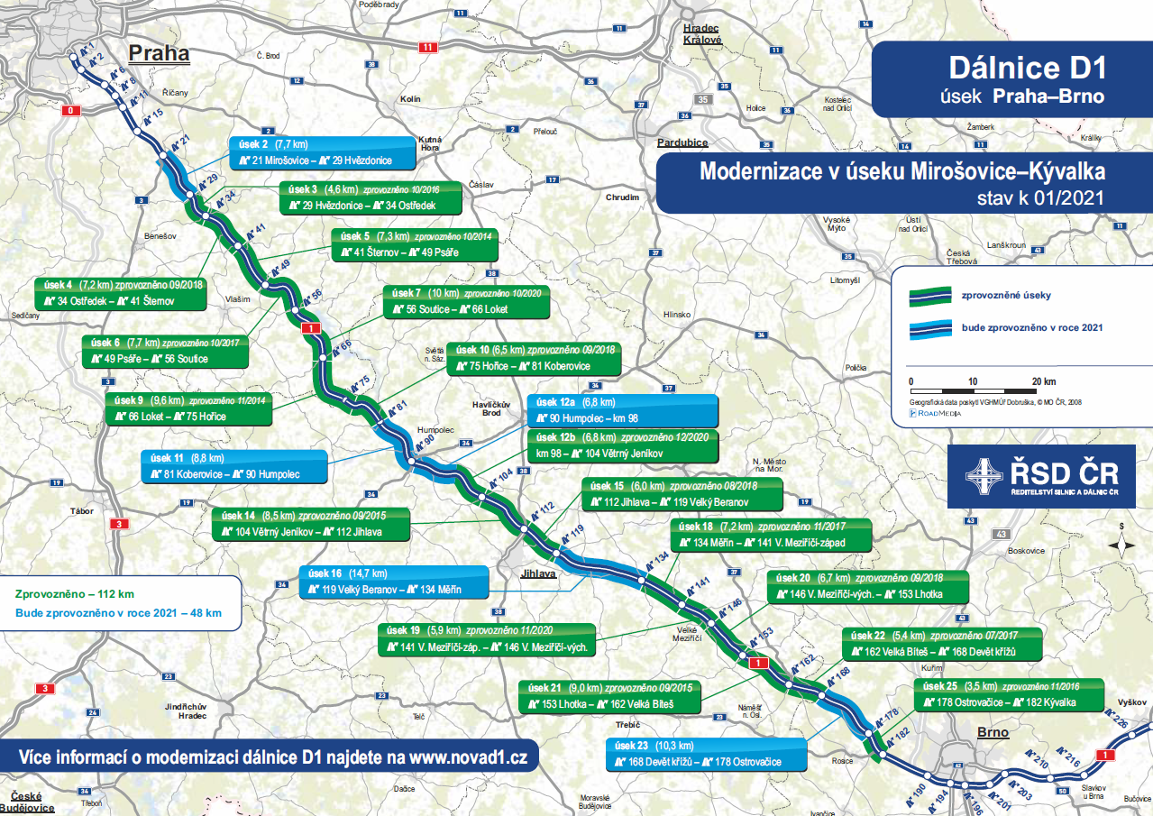 „V letošním roce nám zbývá modernizovat necelých 50 kilometrů dálnice D1, z toho 8 kilometrů na úseku 12 u Humpolce bude hotovo hned na jaře, a to bez větších omezení pro řidiče. V průběhu roku tak budou práce probíhat na čtyřech úsecích v délce zhruba 41 kilometrů“, upřesňuje ministr dopravy Karel Havlíček a dodává: „Modernizace dálnice D1 mezi Mirošovicemi a Kývalkou v celkové délce 161 kilometrů tím letos po devíti letech skončí.“