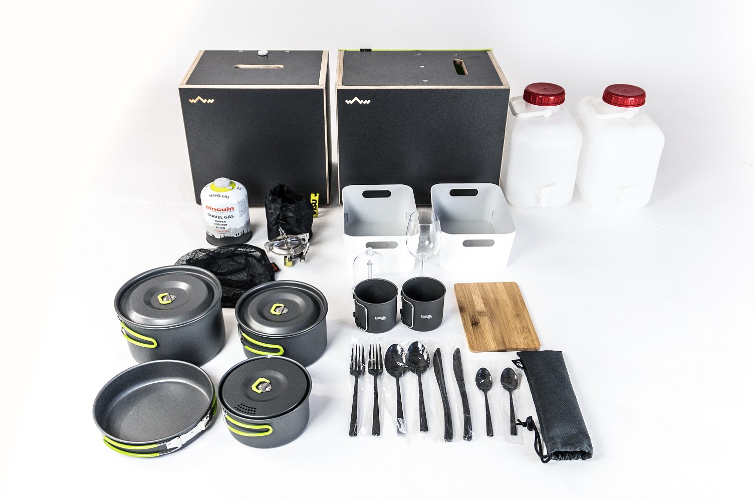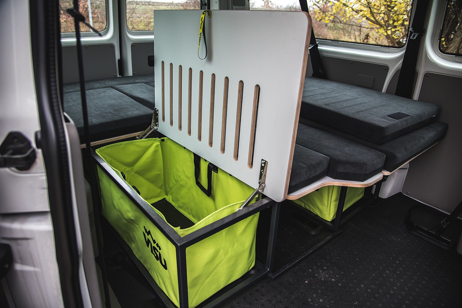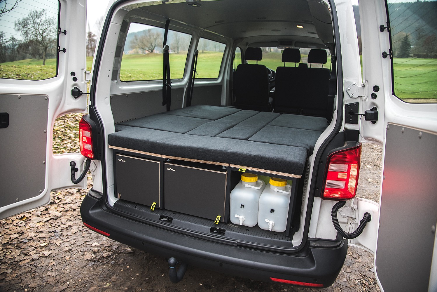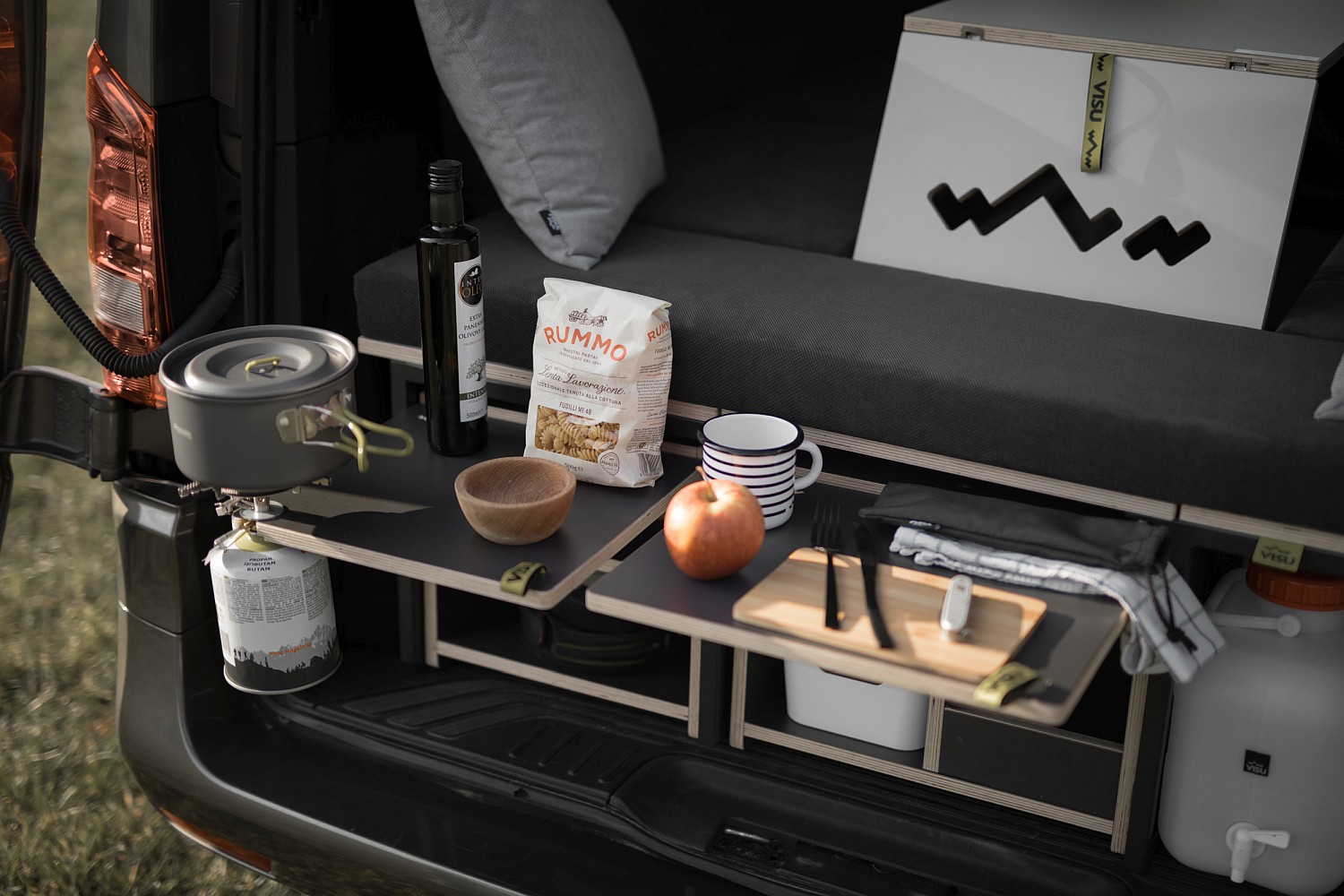 Postel v plné šíři vozu, sezení se stolem, úložné prostory (4x Visu Tashka) – celkem cca 300 litrů, kuchyň, vařicí box, připevnitelný plynový vařič s piezo zapalováním, plynová cartridge 450 g, kempingové nádobí na vaření, úložný box, 2 vyjímatelné plastové boxy, 2 kempingové skládací sklenice na víno, plechové hrnky, bambusové prkénko, 2 sady příborů, kanystry – 2x 10 litrů, kanystry s výpustí na přední straně, kompresorová lednice Indel-B o objemu 30 litrů, horkovzdušné nezávislé topení.