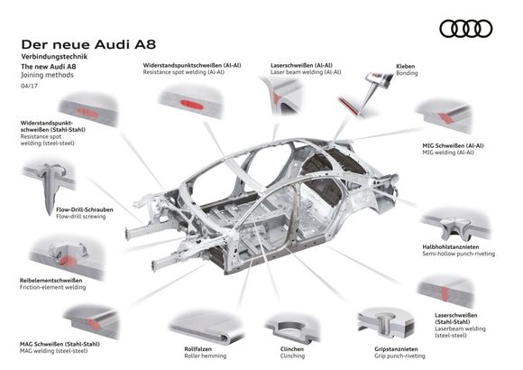 Automobilka posouvá technologie zpracování karoserie na další metu. Lehká a mimořádně pevná konstrukce nové Audi A8 bude dána unikátním použitím čtyř materiálu spolu s nejnovějšími technologiemi v oblasti jejich zpracování a spojování. Prostorová konstrukce Audi Space Frame bude tvořena kombinací hliníku, hořčíku a kompozitů vyztužených uhlíkovými vlákny.