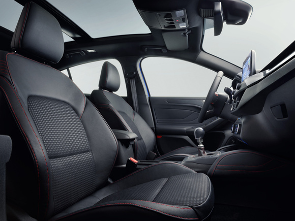 – Focus ST-Line agresivněji navrženým zadním difuzorem a větším střešním spoilerem pro větší aerodynamický přítlak, ale také mohutnějšími předními vstupy vzduchu, které přispívají k vyšší výkonnosti a současně poodhalují součásti motoru, a samozřejmě nápadným označením ST-Line na přídi;