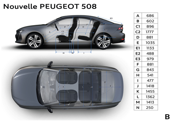 Při pohledu z profilu upoutají pozornost vyvážené proporce, linie střechy je nízko posazená, ladně plynulá, přesně v souladu s principy prémiových automobilů. Peugeot 508 působí kompaktně, měří pouze 475 cm. Tvar karoserie dotvářejí úzké prosklené plochy odhalující bezrámové dveře.