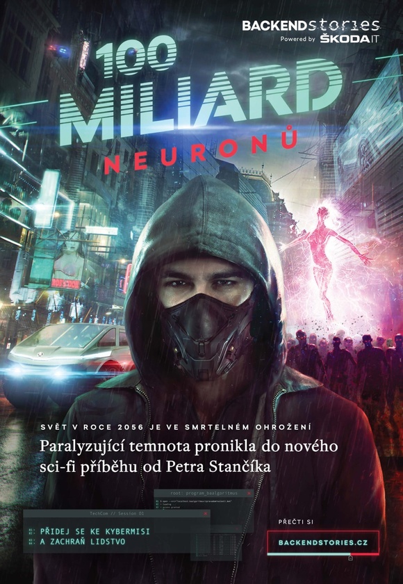Prvním z autorů je Petr Stančík, nositel literární ceny Magnesia Litera. V osmi kapitolách, které jsou postupně po týdnu zveřejňovány, přenáší čtenáře do roku 2056 dílo s názvem „100 miliard neuronů“. Světu hrozí, že ho zastíní paralyzující temnota. Ale hrdina Baalgoritmus rozjíždí s pomocí čtenářů záchrannou akci. Samotní čtenáři totiž mohou interaktivně spoluovlivňovat příběh tak, že se sci-fi hrdinou mohou komunikovat pomocí messengeru Talkbe. Vyměňovat si informace, přicházet s nápady na řešení, nebo chránit hrdiny před nebezpečnými situacemi – to vše je možné. Čtenář má tak možnost dozvědět se netradiční formou sci-fi povídek o práci ve Škoda IT a zároveň se může různými interaktivními prvky a gamifikacemi do příběhu zapojit.