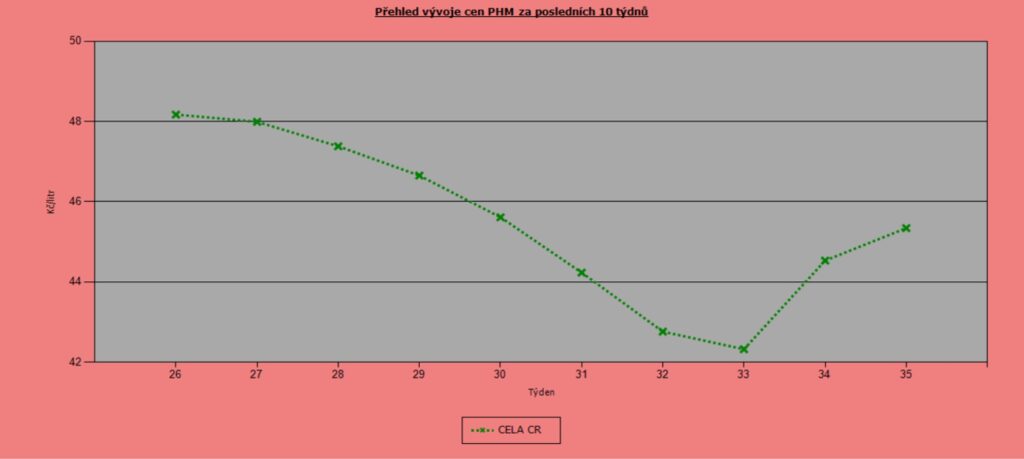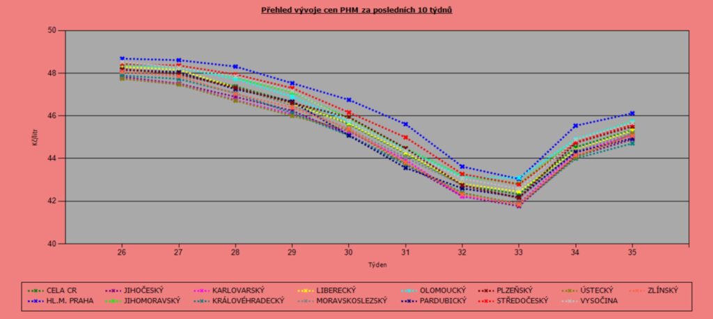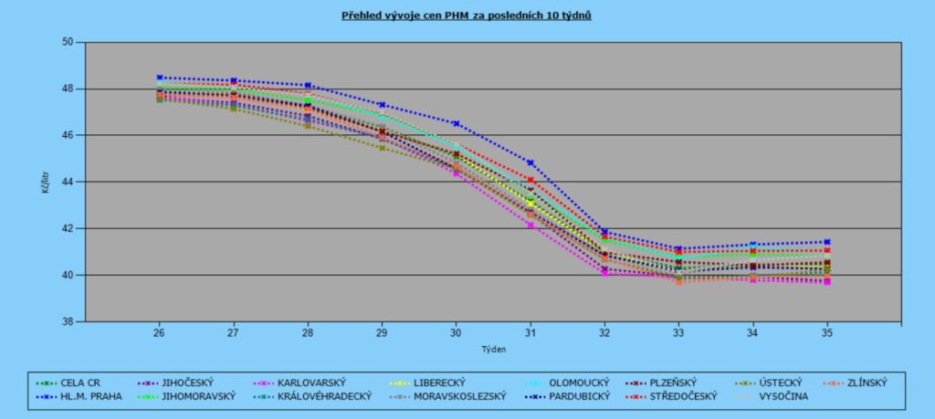Nejlevněji vychází nafta v Královéhradeckém (44,71 Kč/l) a Jihočeském kraji (44,90 Kč/l). Nejvyšší ceny zůstávají opět v Praze (46,12 Kč/l) a v Jihomoravském kraji (45,74 Kč/l).