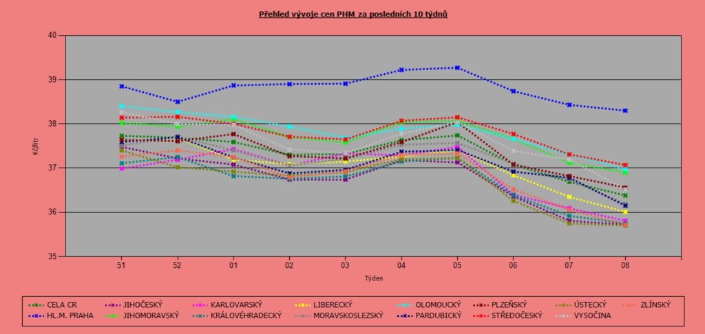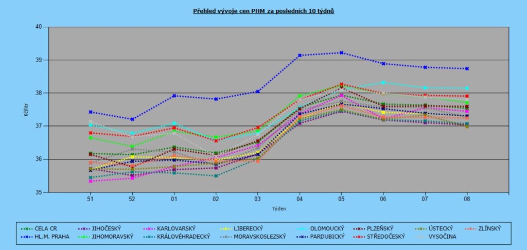 Nejlevněji vychází nafta v Ústeckém (35,70 Kč/l) a Jihočeském kraji (35,72 Kč/l) . Nejvyšší ceny zůstávají opět v Praze (38,30 Kč/l) a Středočeském kraji (37,07 Kč/l).