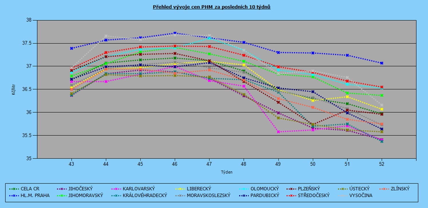 Již tradičně si lidé řádně připlatí při tankování v Praze (37,07 Kč/l) a Středočeském kraji (37,62 Kč/l). Dotankovat naopak doporučujeme v Královéhradeckém kraji (35,37 Kč/l), dále pak v Karlovarském kraji (35,40 Kč/l).