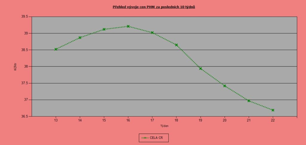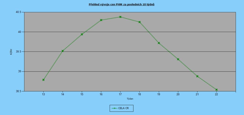 Ceny pohonných hmot nadále klesají. V uplynulém týdnu tankujeme Natural 95 levněji v průměru o 34 haléřů na litru a za litr zaplatíme 38,54 korun. Na litru nafty uspoříme 28 haléřů a jeho cena je 36,69 korun.