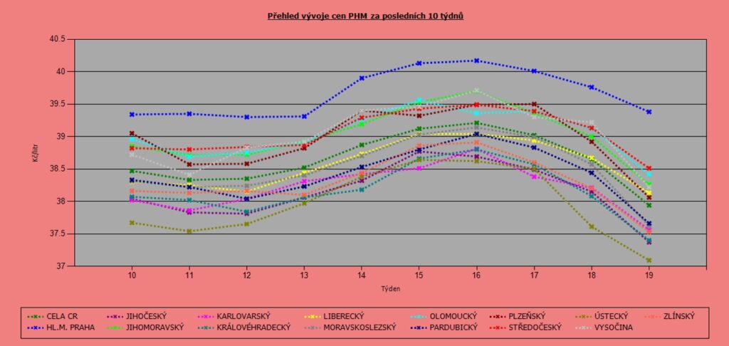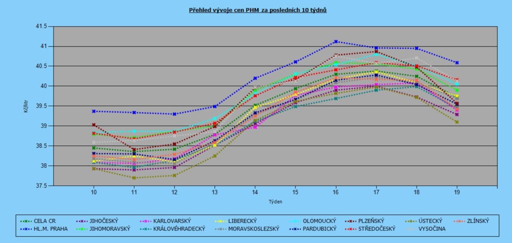Za Natural 95 zaplatí nejvíce tradičně řidiči v Praze (40,59 Kč/l) a nevyplatí se jim tankovat ani ve Středočeském kraji (40,10 Kč/l). Dotankovat naopak doporučujeme v Ústeckém (39,10 Kč/l) a Jihočeském kraji (39,29 Kč/l).