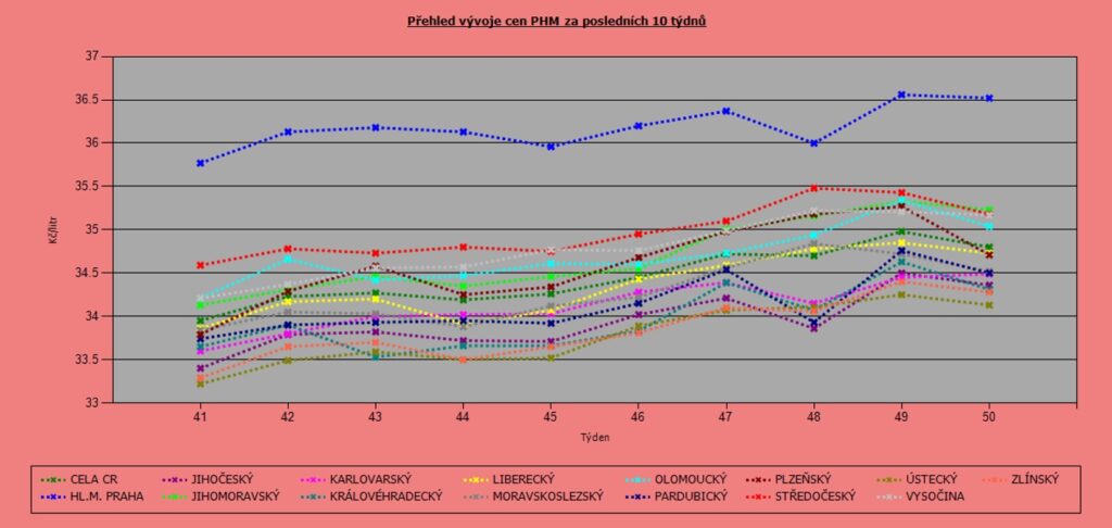 Natural 95 je výrazně nejdražší v Praze (36,89 Kč/l) a za ní je Vysočina (36,13 Kč/l). Nejlevněji vychází benzín v Jihočeském (35,06 Kč/l) a Karlovarském kraji (35,15 Kč/l).