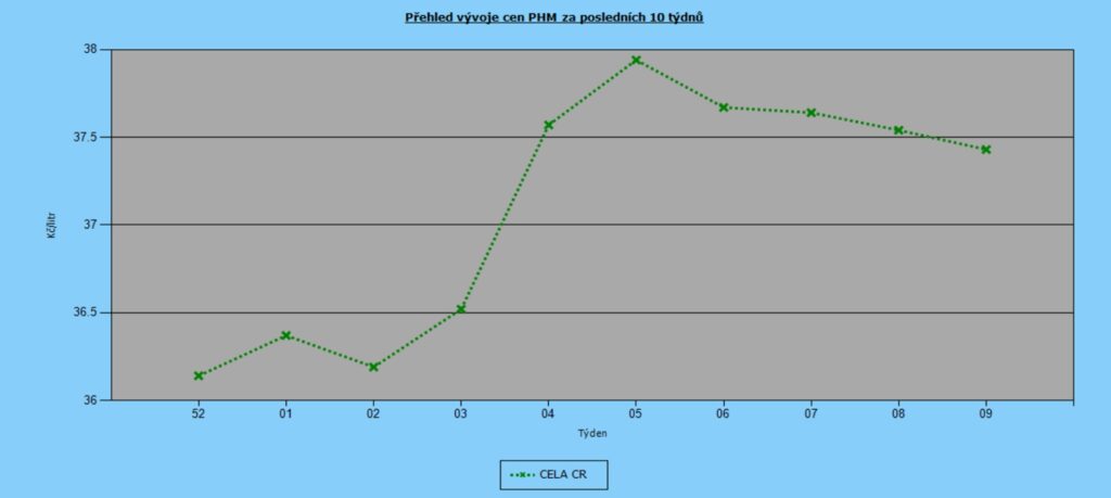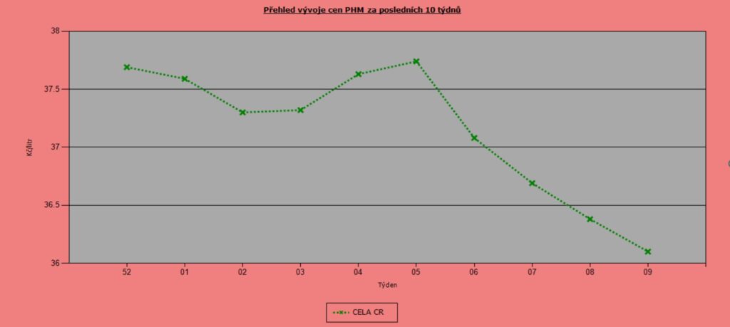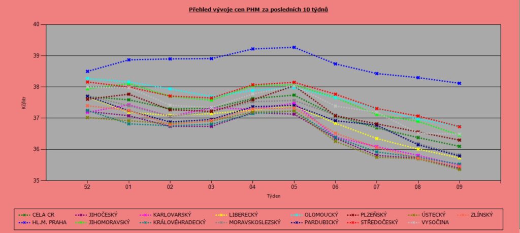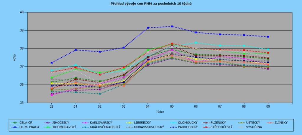 Před sedmi týdny stoupla cena Naturalu 95. Přes hranici 38 korun za litr se však nepřehoupla a v posledních čtyřech týdnech opět postupně klesá. Aktuálně řidiči benzín tankují v průměru za 37,43 Kč/l. I nafta v posledních šesti týdnech zlevňuje a po dlouhé době za ni zaplatíme v průměru 36,10 Kč/l, což je výrazně méně než za benzín. Pokračuje také trend výrazně vyšších cen v Praze oproti ostatním krajům.