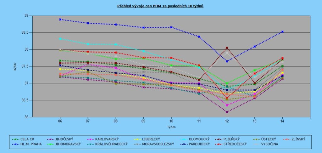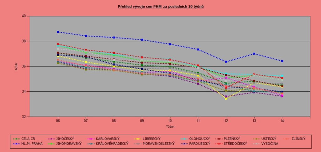 Nejlevněji vychází nafta v Jihočeském (33,63 Kč/l) a Karlovarském kraji (33,69 Kč/l) . Nejvyšší ceny zůstávají opět v Praze (36,43 Kč/l) a Olomouckém kraji (35,25 Kč/l).