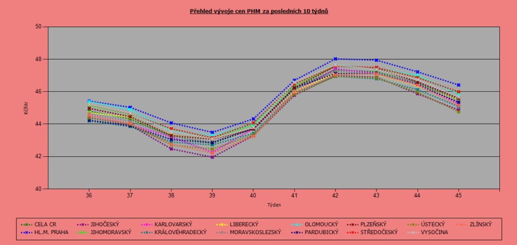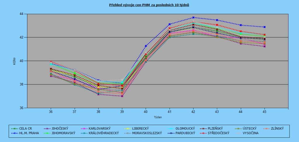 Nejlevněji vychází nafta v kraji Jihočeském (44,87 Kč/l) a vyplatí se přibrzdit také v kraji Královéhradeckém (45,08 Kč/l). Nejvyšší ceny zůstávají opět v Praze (46,41 Kč/l) a Olomouckém kraji (45,99 Kč/l).