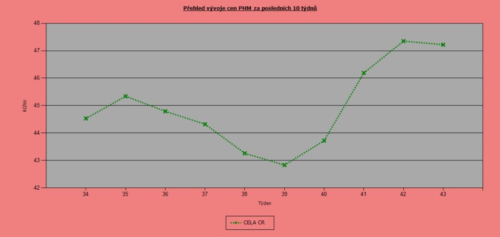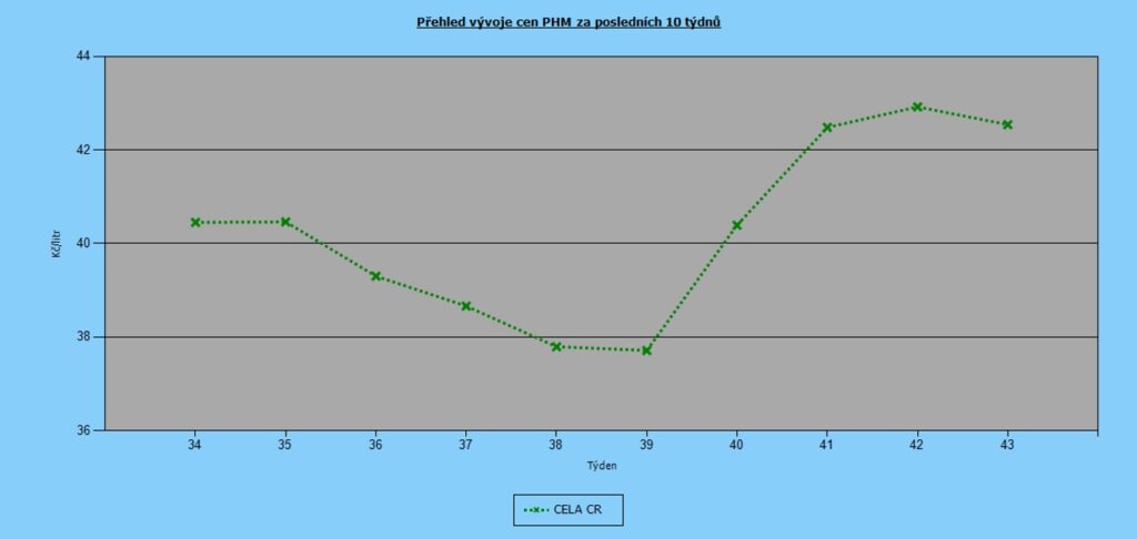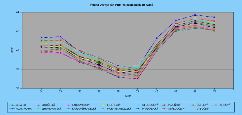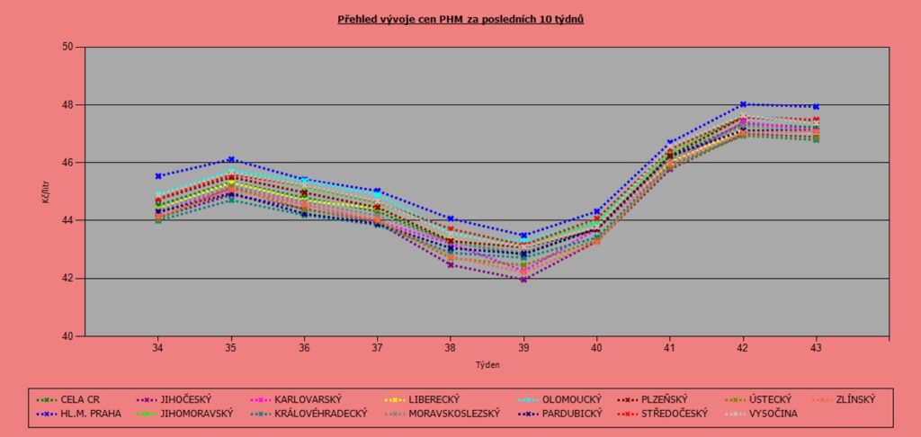 Nejdražšími kraji zůstává tradičně Praha (43,48 Kč/l) a Středočeský kraj (43,07 Kč/l). Naopak nejnižší ceny jsou Karlovarském (42,07 Kč/l) a Jihočeském kraji (42,09 Kč/l)