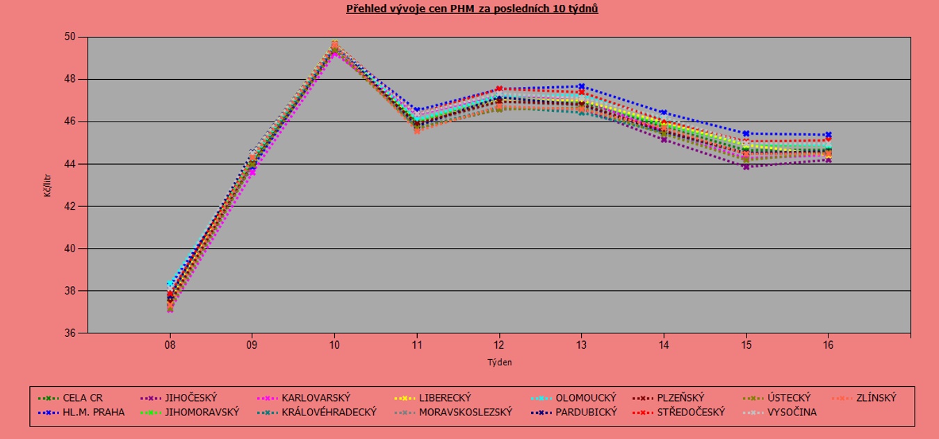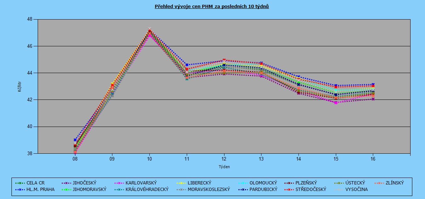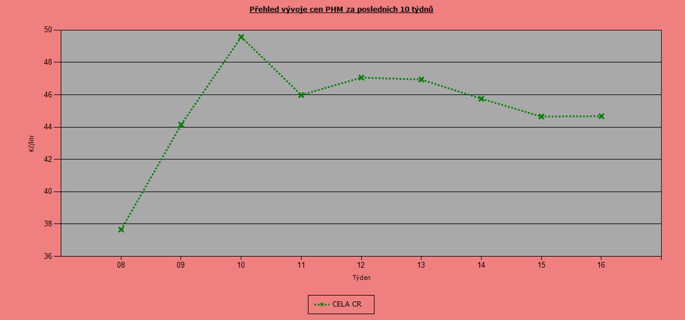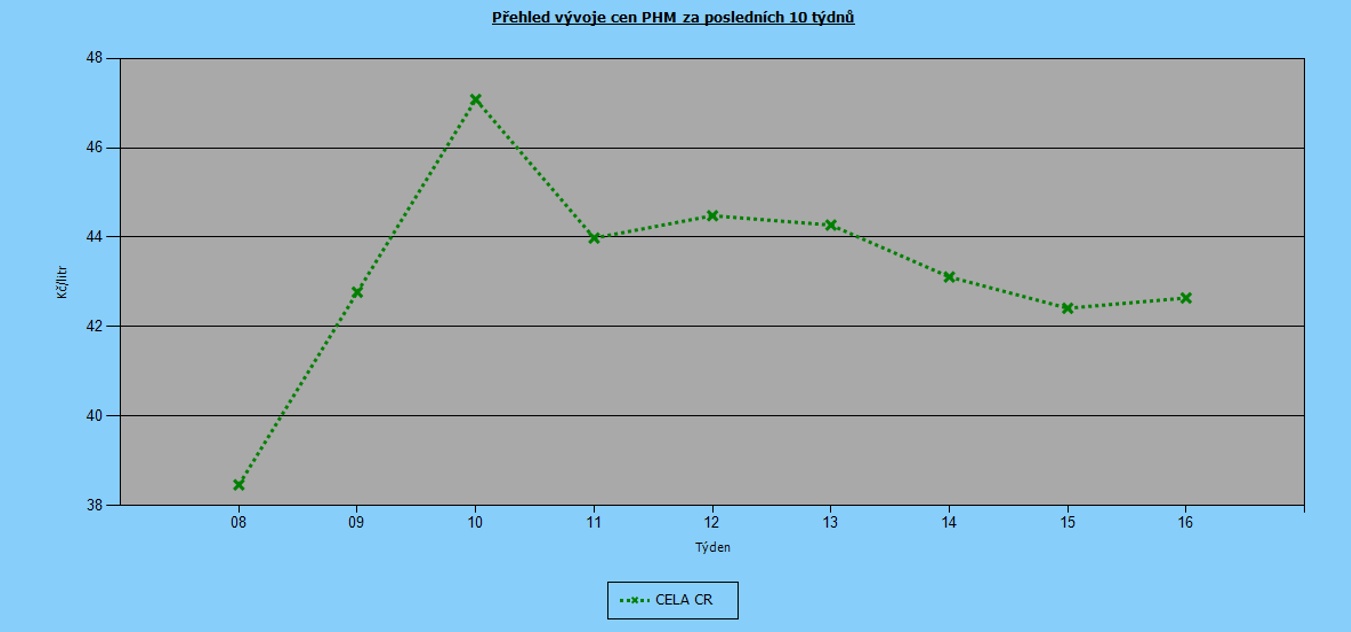 Nehledě na předešlé výrazné zdražení pohonných hmot, s příchodem letní sezóny hladina opět stoupá. Natural 95 se v průměru vrátil nad 43 korun za litr (43,11 Kč/l) a nafta nad 45 korun za litr (45,75 Kč/l).
